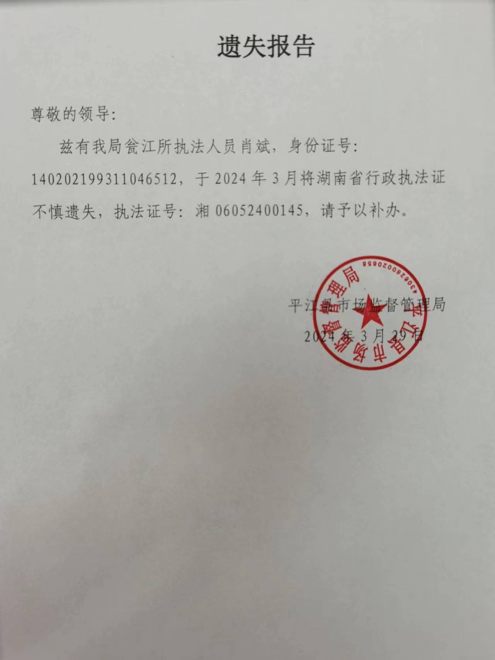 遗失声明(县市场监督管理局肖斌)