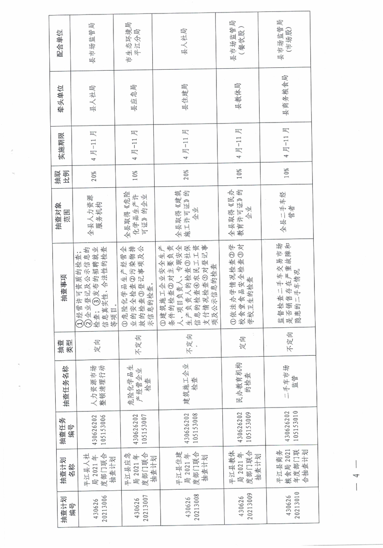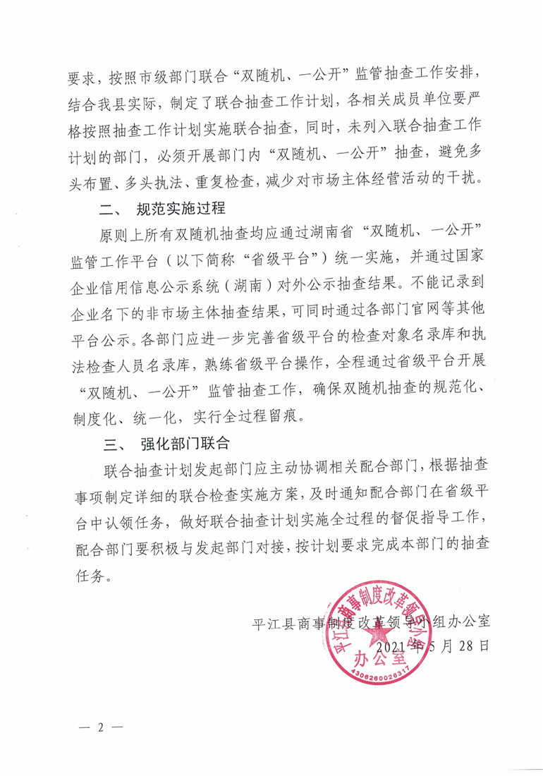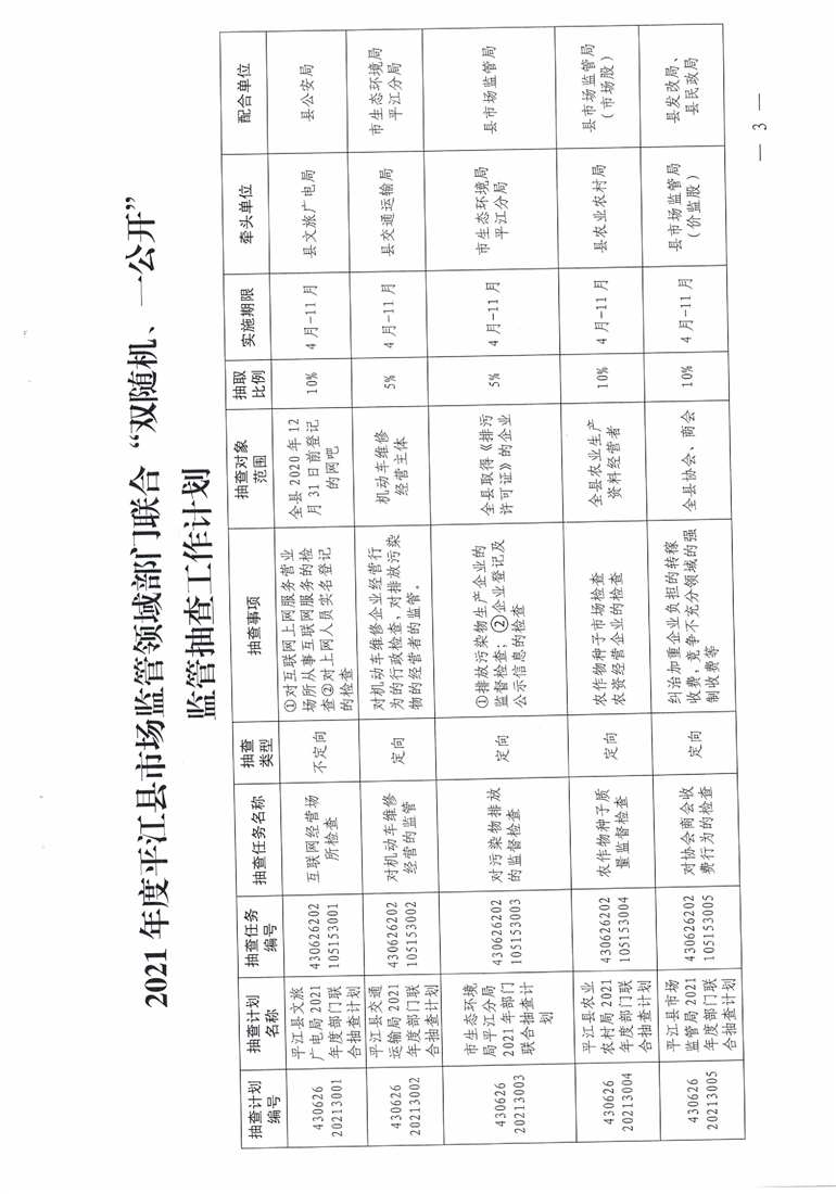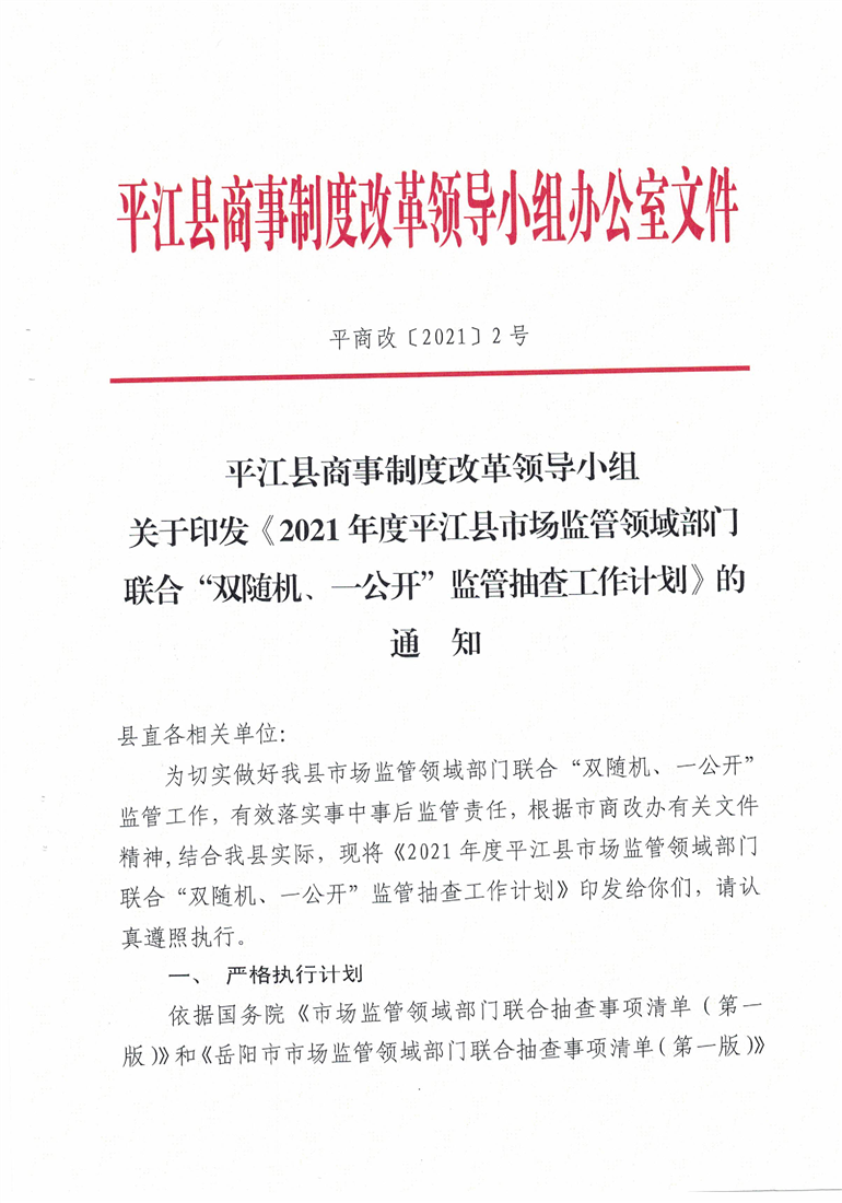 2021年度平江县市场监管领域部门联合双随机一公开工作计划