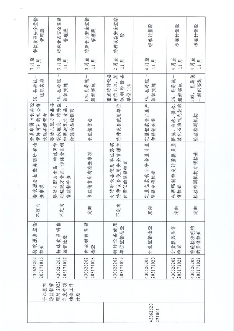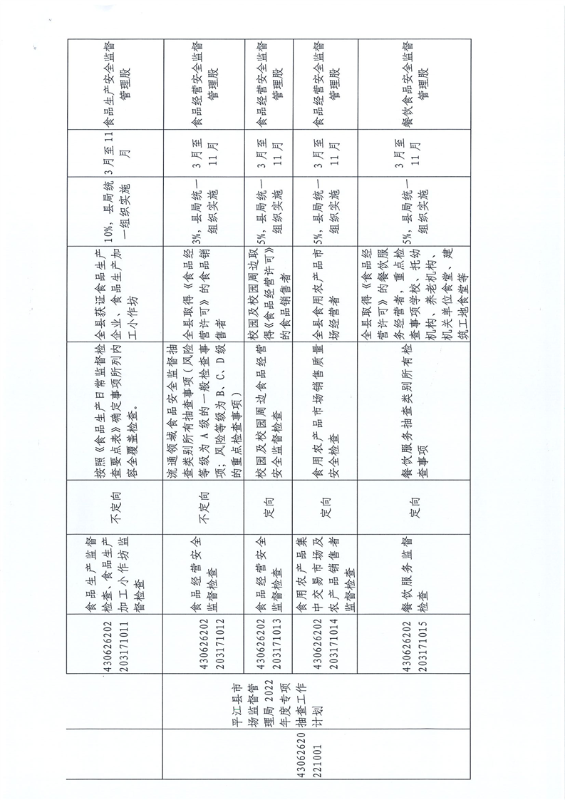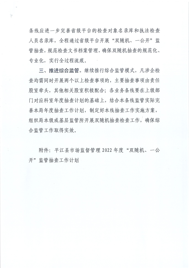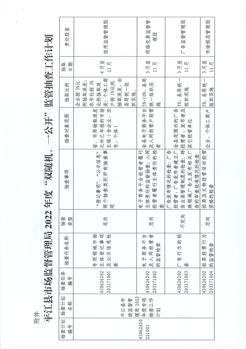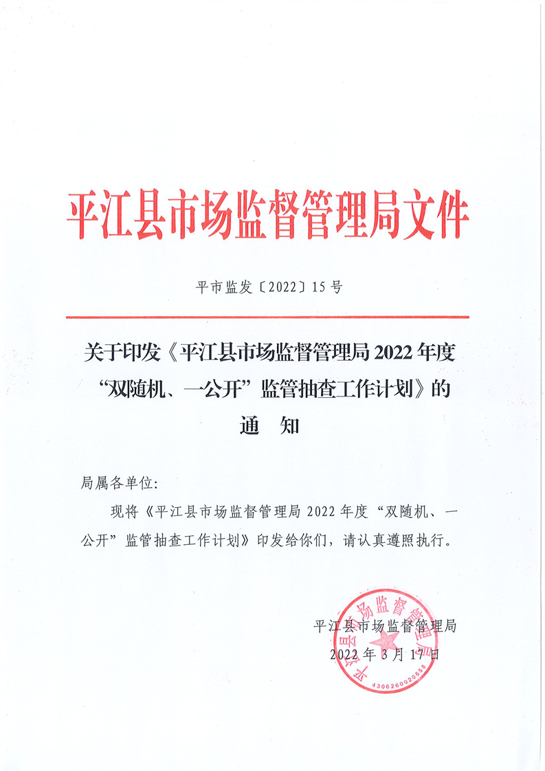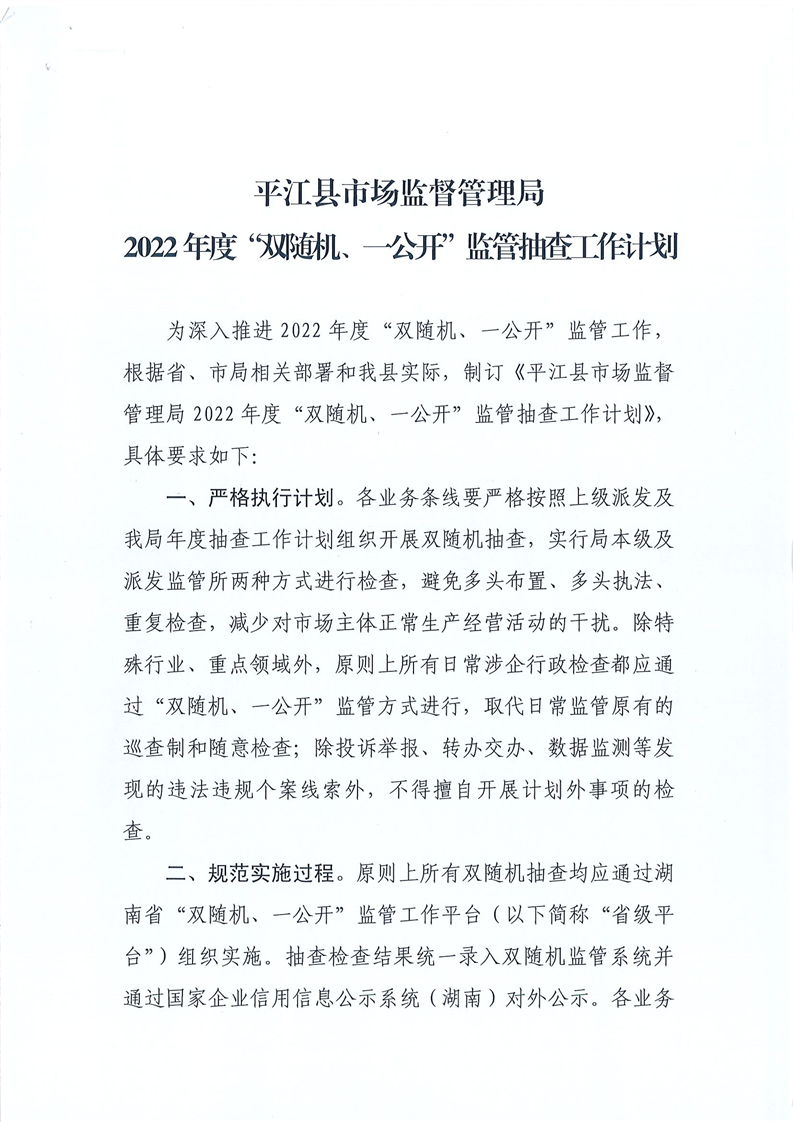平江县市场监督管理局2022年度“双随机、一公开”监管抽查工作计划