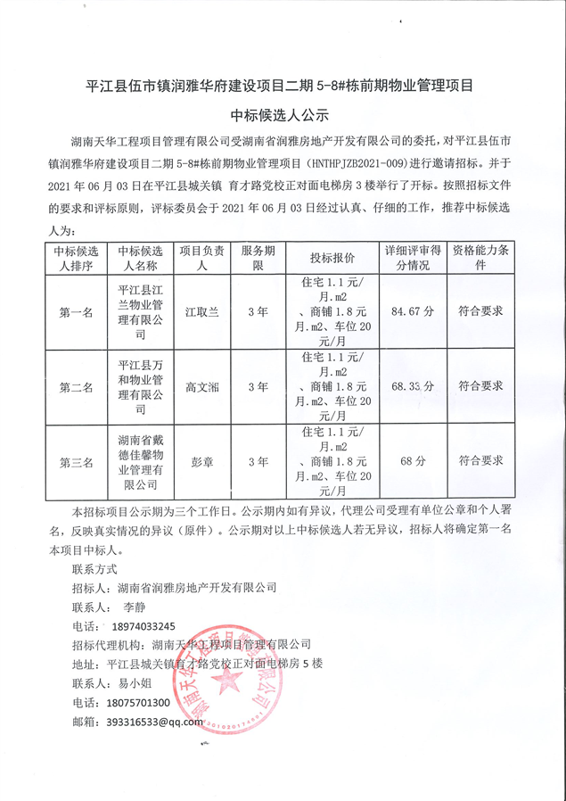 平江县伍市镇润雅华府建设项目二期5~8栋前期物业管理项目中标候选人公示