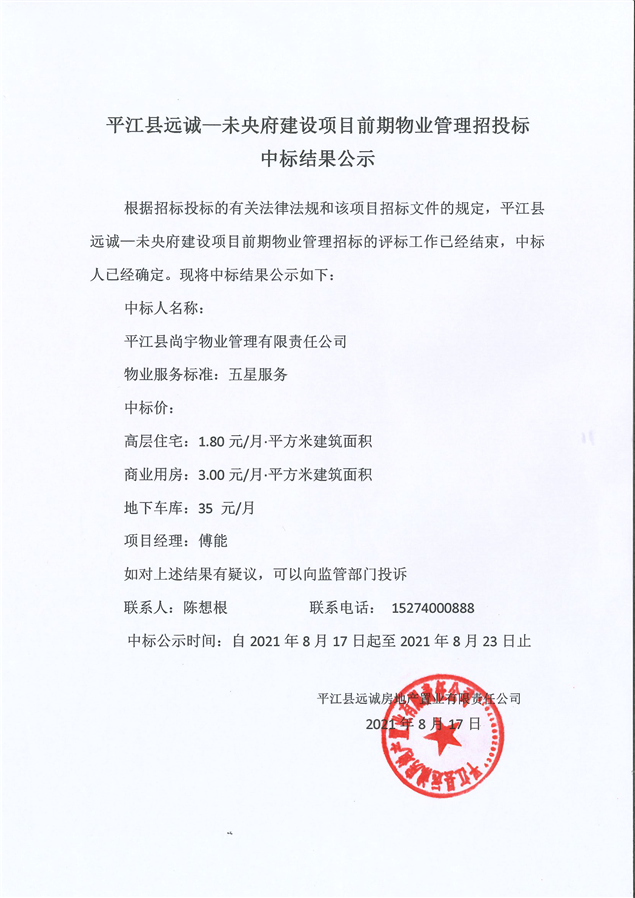平江县远诚——未央府建设项目前期物业管理招投标中标结果公示
