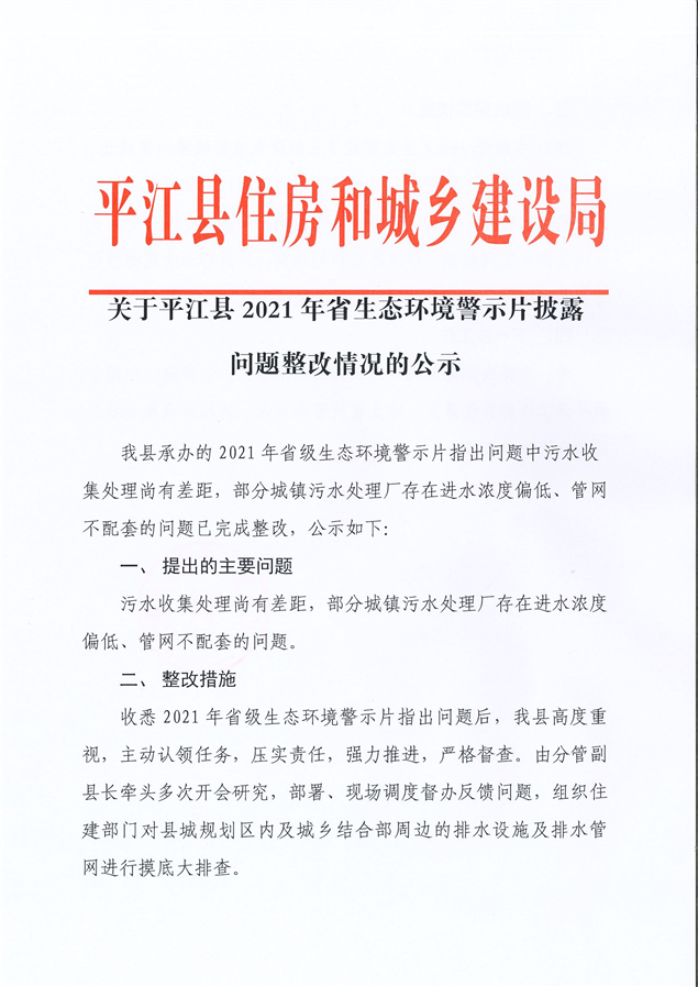 关于平江县2021年省生态环境警示片披露问题整改情况的公示