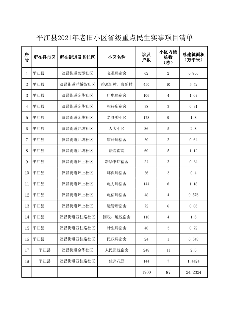 平江县2021年老旧小区省级重点民生实事项目清单