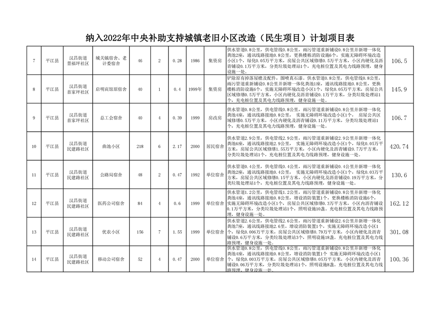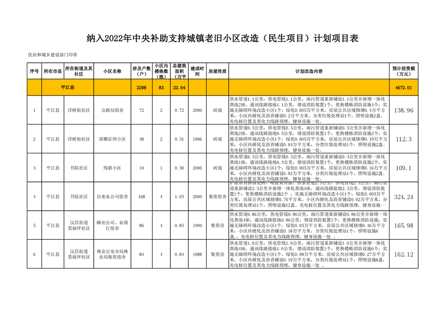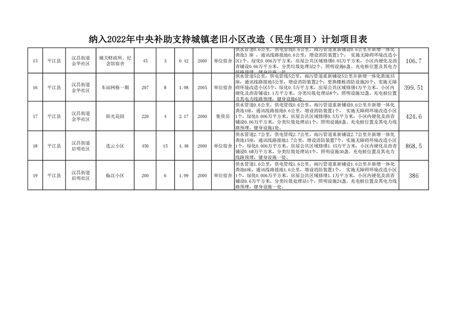 纳入2022年中央补助支持城镇老旧小区改造(民生项目)计划项目表