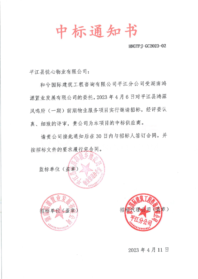 中标通知书——鸿源凤鸣府(一期)前期物业服务