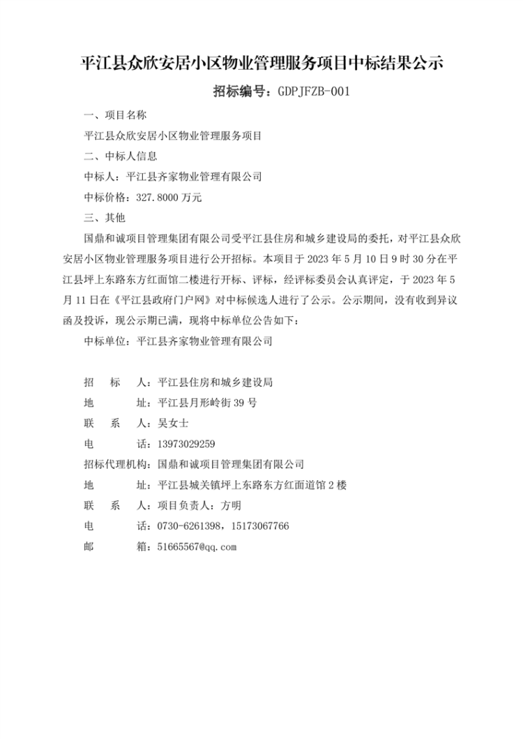 中标结果公示(平江县众欣安居小区物业管理服务项目)