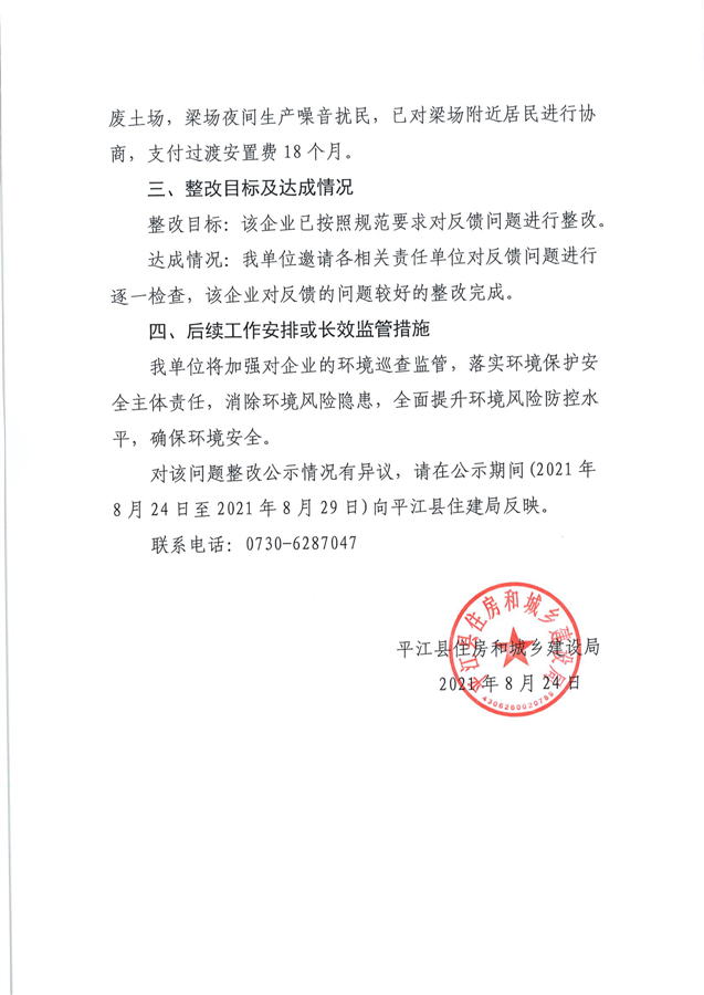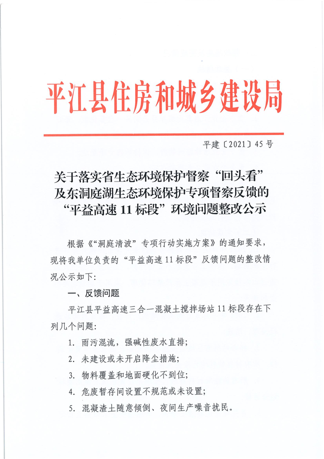 关于落实省生态环境保护督察“回头看”及东洞庭湖生态环境保护专项督察反馈的“平益高速11标段”环境问题整改公示