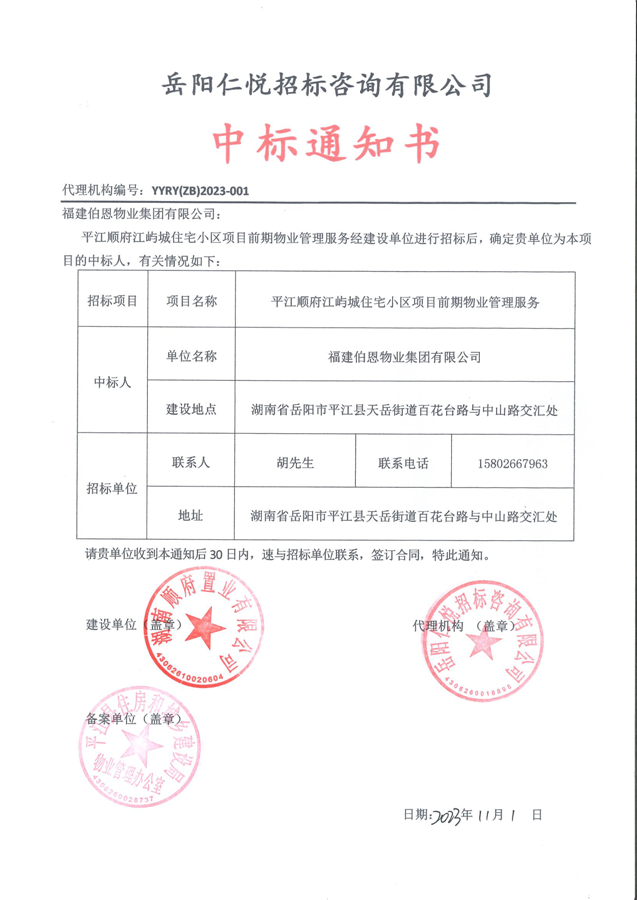 中标候选人公示(顺府江屿城住宅小区项目前期物业管理服务)