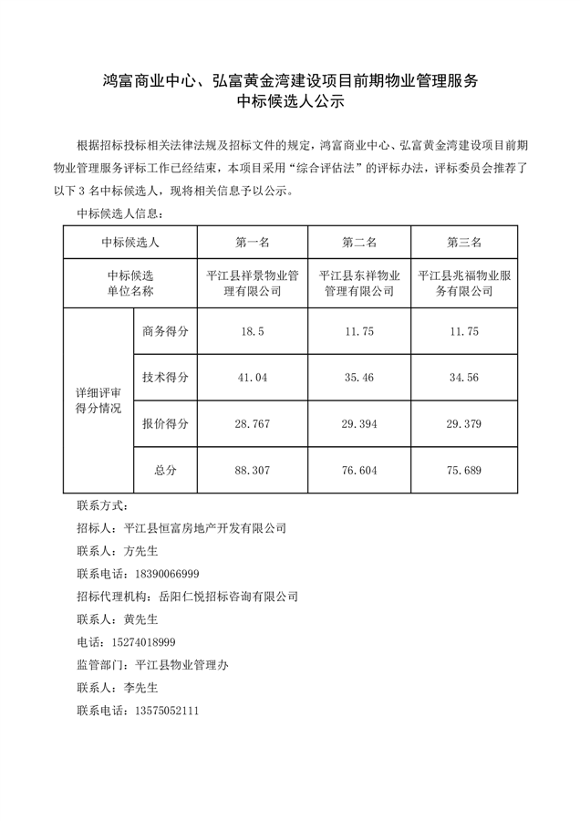 鸿富商业中心、弘富黄金湾建设项目前期物业管理服务中标候选人公示