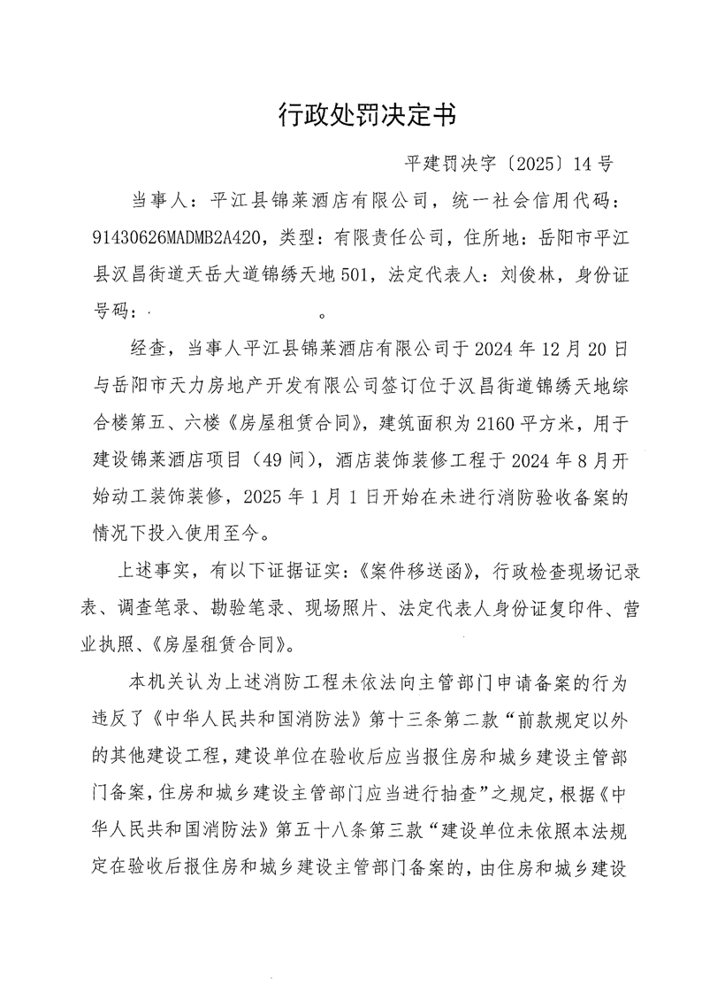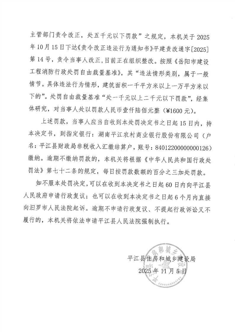 行政处罚决定书(平建罚决字[2025]14号)