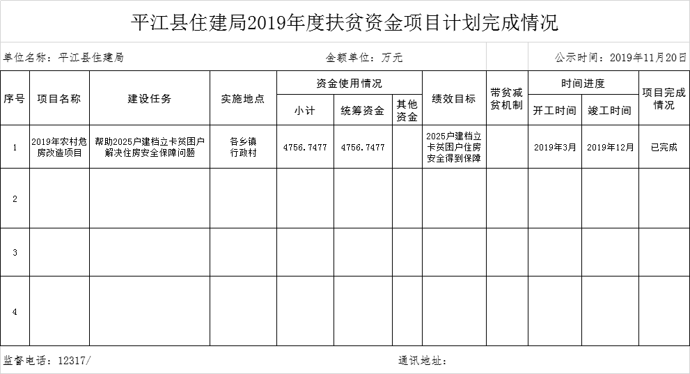 平江县住建局2019年度扶贫资金项目计划完成情况