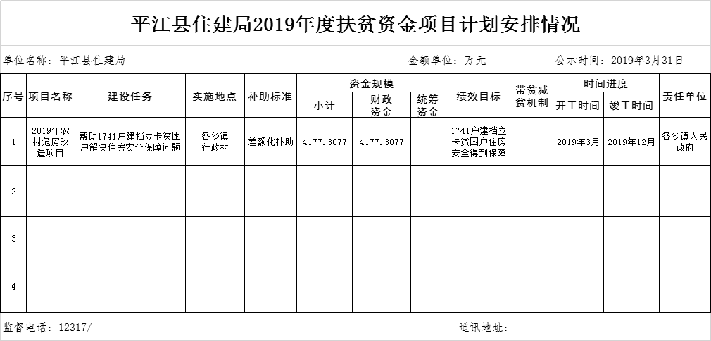 平江县住建局2019年度扶贫资金项目计划安排情况