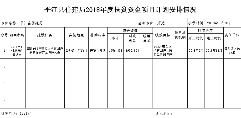 平江县住建局2018年度扶贫资金项目计划安排情况