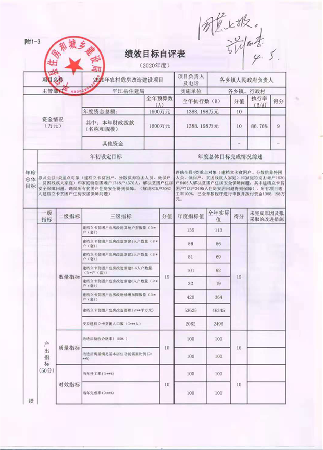 2020年农村危房改造建设项目绩效目标自评表