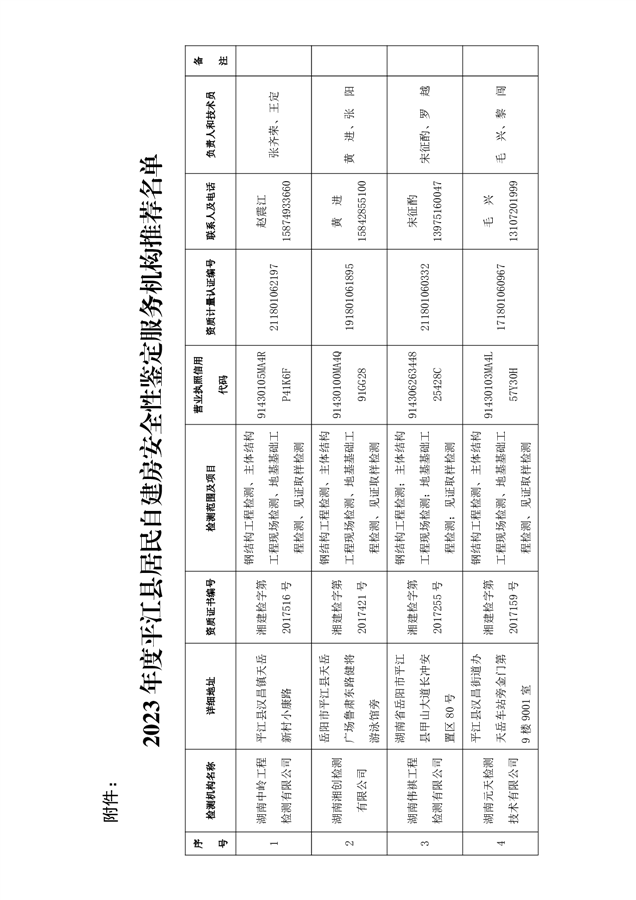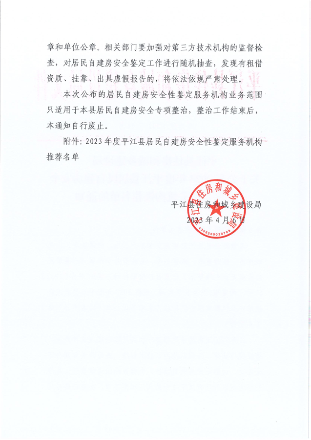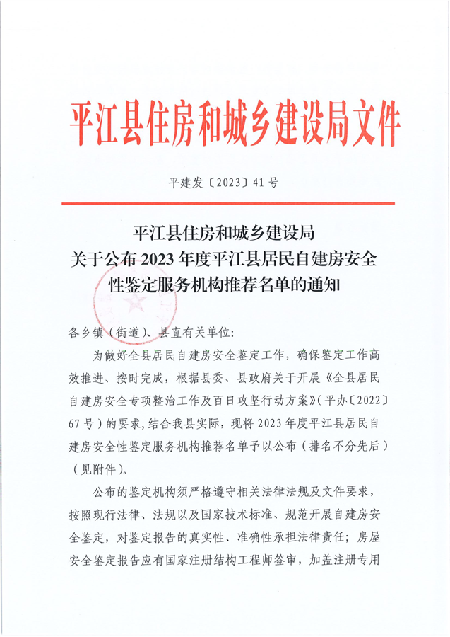 关于公布2023年度平江县居民自建房安全性鉴定服务机构推荐名单的通知(平建发[2023]41号)