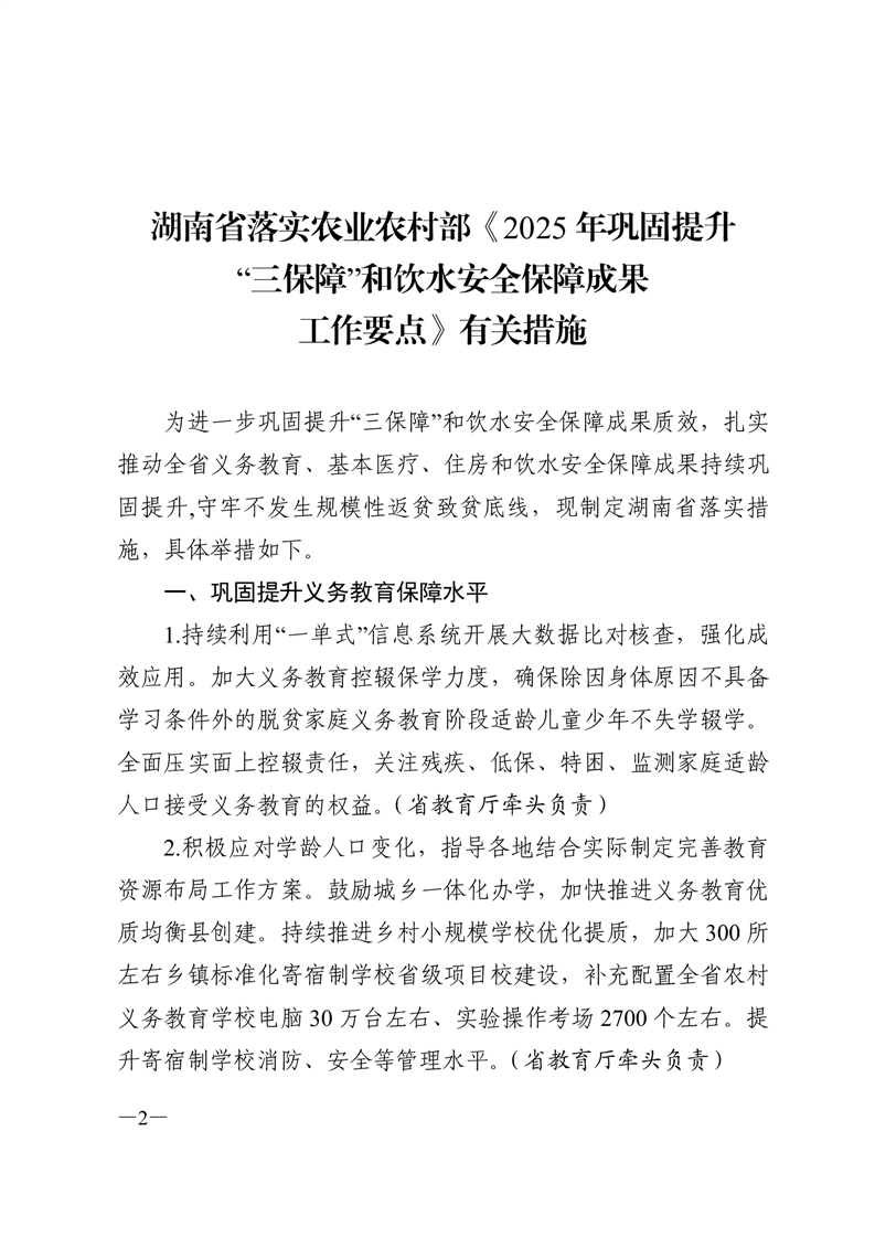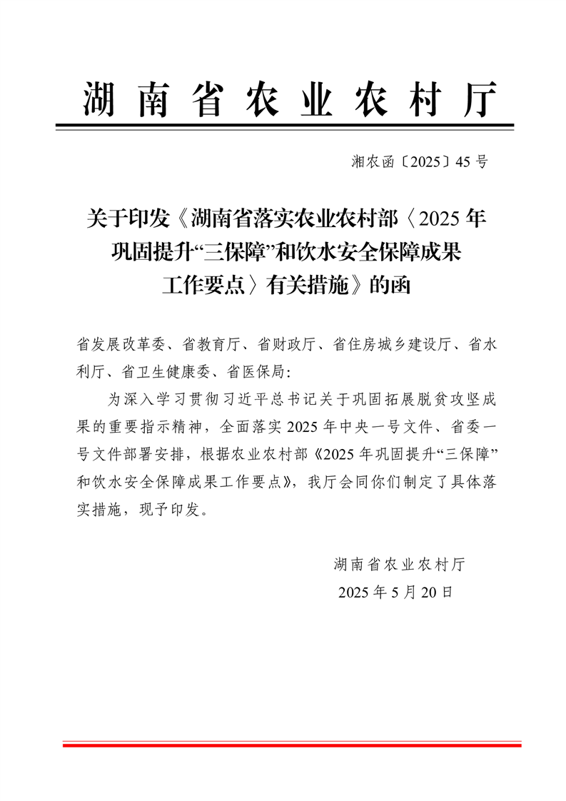 《2025年巩固提升“三保障”和饮水安全保障成果工作要点》(湘农函[2025]45号)