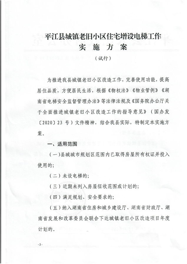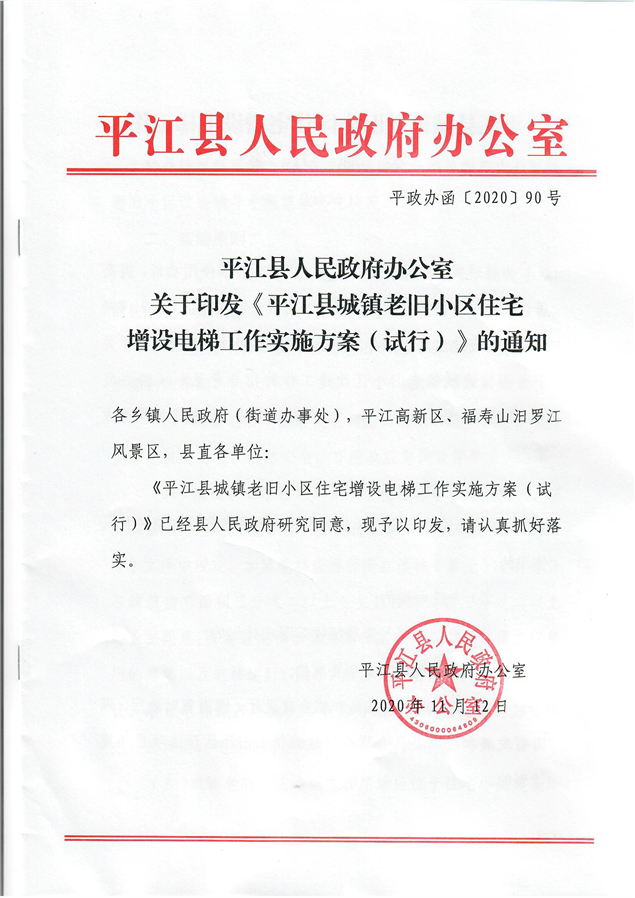 平江县人民政府办公室关于印发《平江县城镇老旧小区住宅增设电梯工作实施方案(试行)》的通知(平政办函[2020]90号)