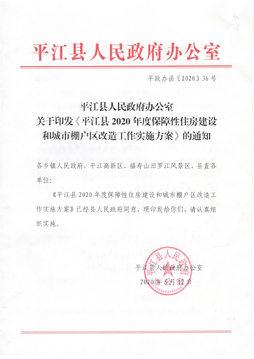 (平政办函[2020]36号)平江县人民政府办公室关于印发《平江县2020年度保障性住房建设和城市棚户区改造工作实施方案》的通知