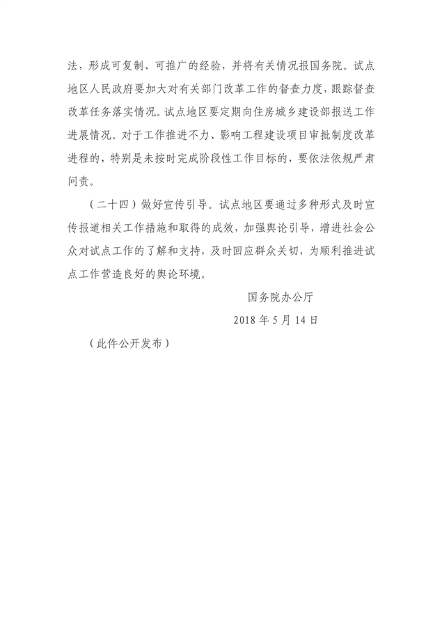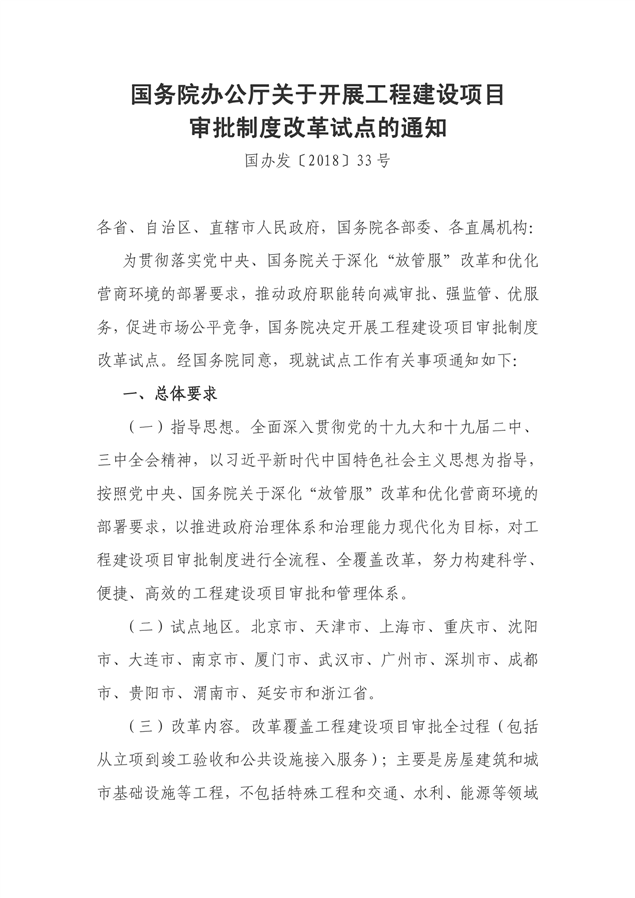国务院办公厅关于开展工程建设项目审批改革试点的通知(国办发[2018]33号)