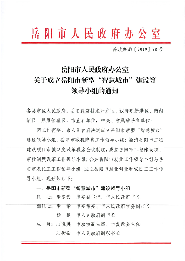 岳阳市人民政府办公室关于成立岳阳市新开“智慧城市”建设等领导小组的通知(岳政办函[2019]28号)
