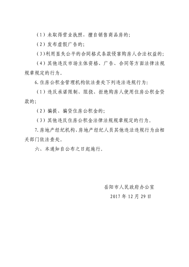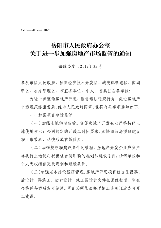 岳阳市人民政府办公室关于进一步加强房地产市场监管的通知(岳政办发[2017]35号)