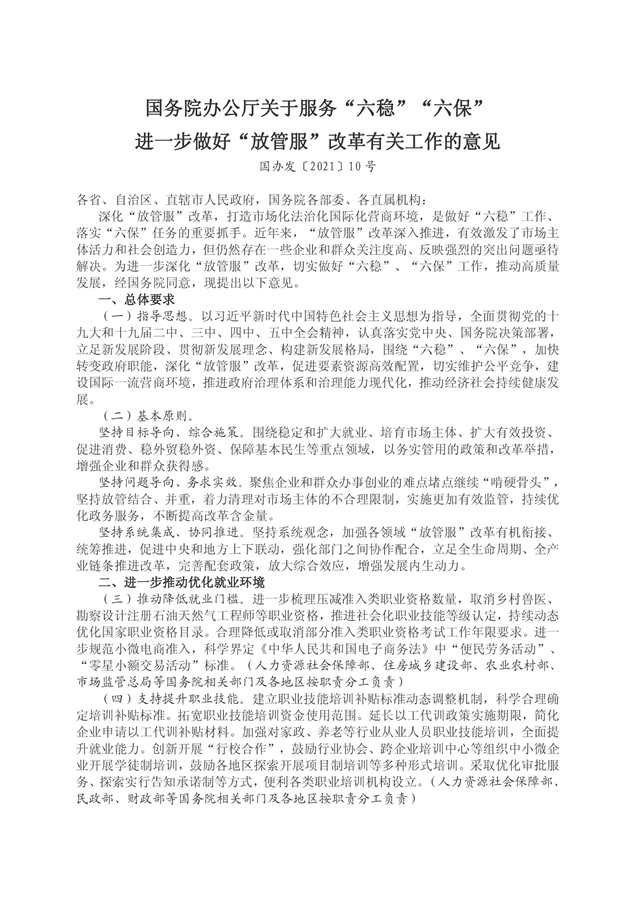 《国务院办公厅关于服务“六稳”“六保”进一步做好“放管服”改革有关工作的意见》(国办发〔2021〕10号)