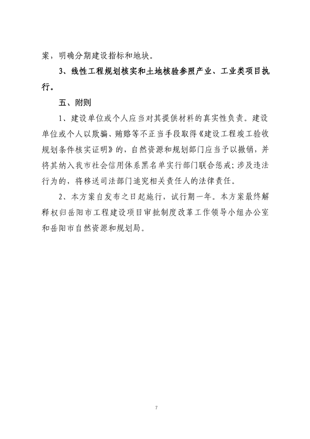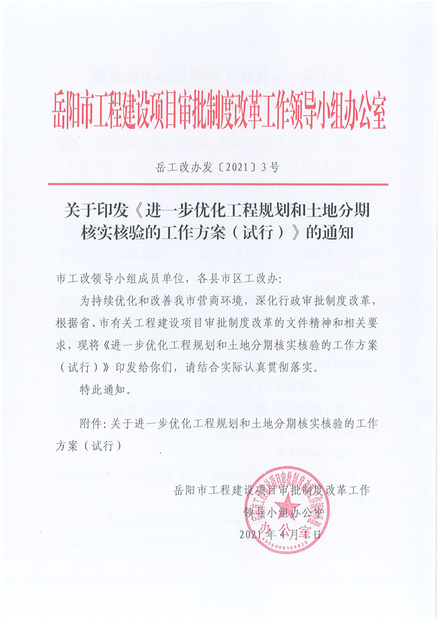 关于印发《进一步优化工程规划和土地分期核实核验的工作方案(试行)》的通知(岳工改办发[2021]3号)