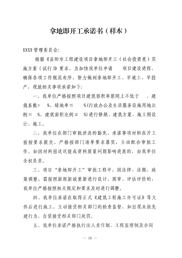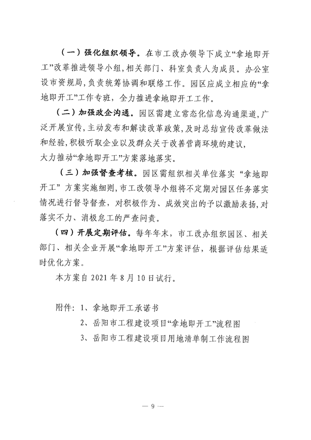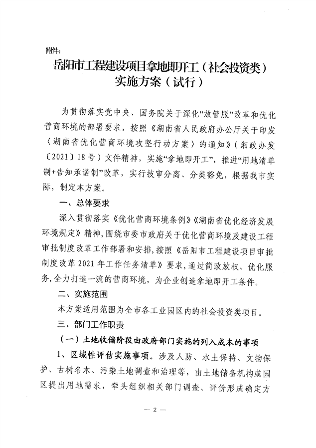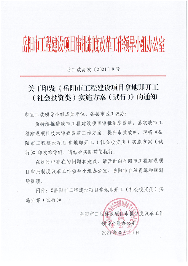 关于印发《岳阳市工程建设项目拿地即开工(社会投资)实施方案(试行)》的通知(岳工改办发〔2021〕9号)