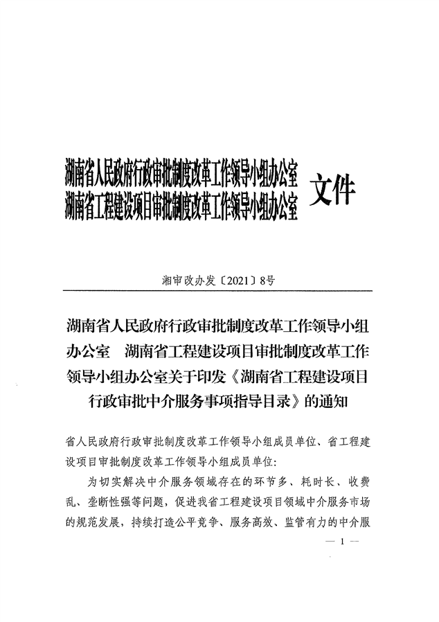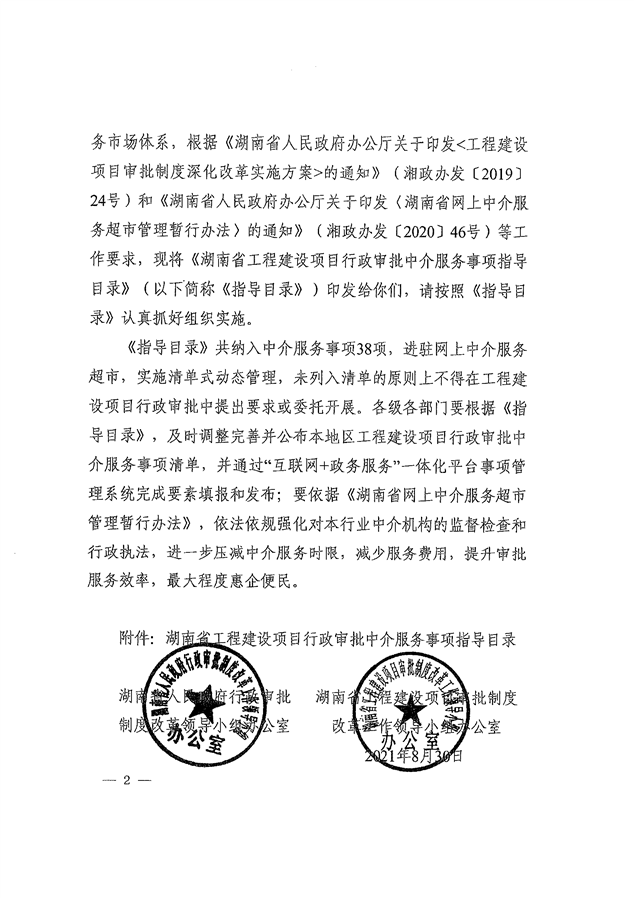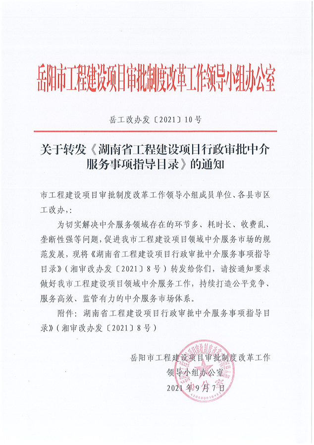 关于转发《湖南省工程建设项目行政审批中介服务事项指导目录》的通知(岳工改办发[2021]10号)
