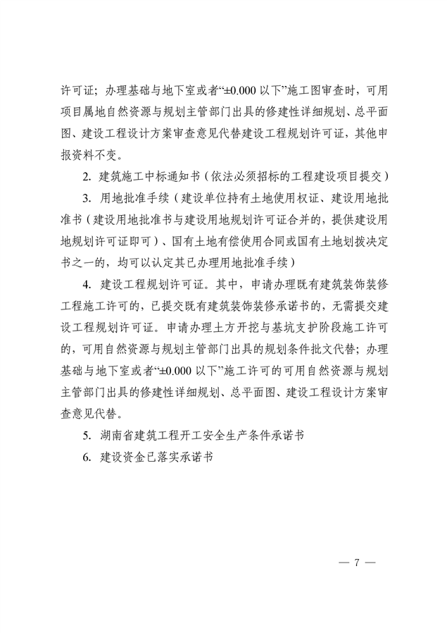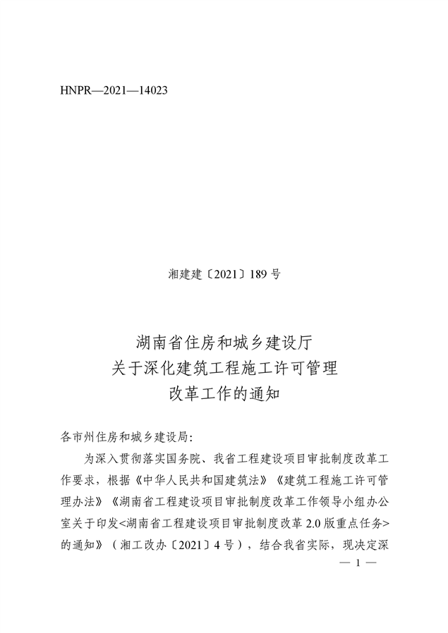 《湖南省住房和城乡建设厅关于深化建筑工程施工许可管理改革工作的通知》(湘建建[2021]189号)