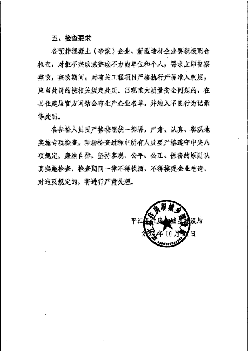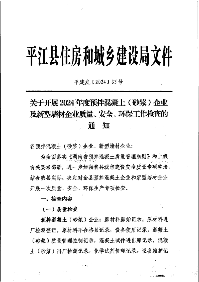 关于开展2024年度预拌混凝土(砂浆)企业及新型墙材企业质量、安全、环保工作检查的通知(平建发〔2024〕33号)