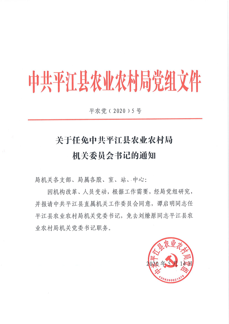 关于任免中共平江县农业农村局机关委员会书记的通知