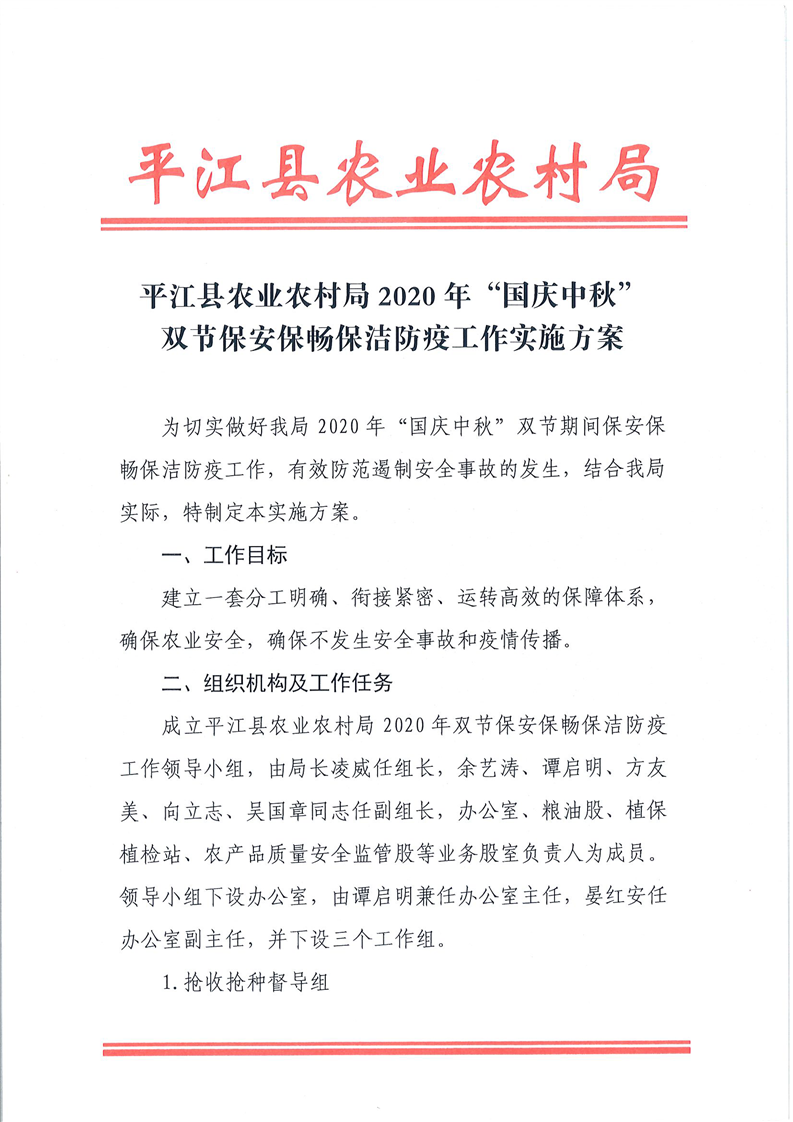 平江县农业农村局2020年“国庆中秋”双节保安保畅保洁防疫工作实施方案