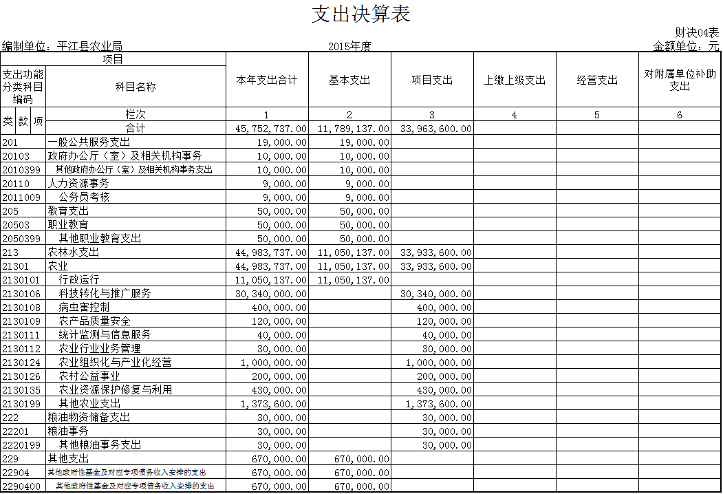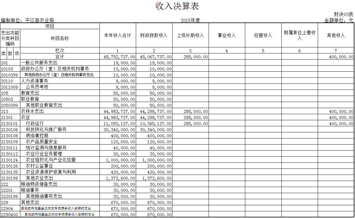 1、收入:全年收入4575.2737万元,期中年初预算888.22万元,省市县项目追加3381.36万元(其中①2014年2130106技术推广与培训3034万元:基层农业技术推广体系建设150万元.平江新增粮食生产田间工程建设2400万元.测土配方施肥补贴资金90万元; ②2130108病虫害控制:重大农作物病虫害防治40万元; ③2130109农产品质量安全:农产品质量安全管理12万元;2130135农业资源与保护43;⑤2130124农业组织化与产业化经营:水稻集中育秧专项资金100万元;⑥2130126农村公益事业:乡村清洁工程资金20万元;⑦2130199其他农业支出:粮食生产补助与奖励137.36万元;⑧22904政府基金67万元;行政运行追加177.2937万元(追加原因预算调整2014.10-2015.12工资调整129.4,);上级补助收入28.5万;其他收入40万元(2015年农业保险工作经费40万元,)。