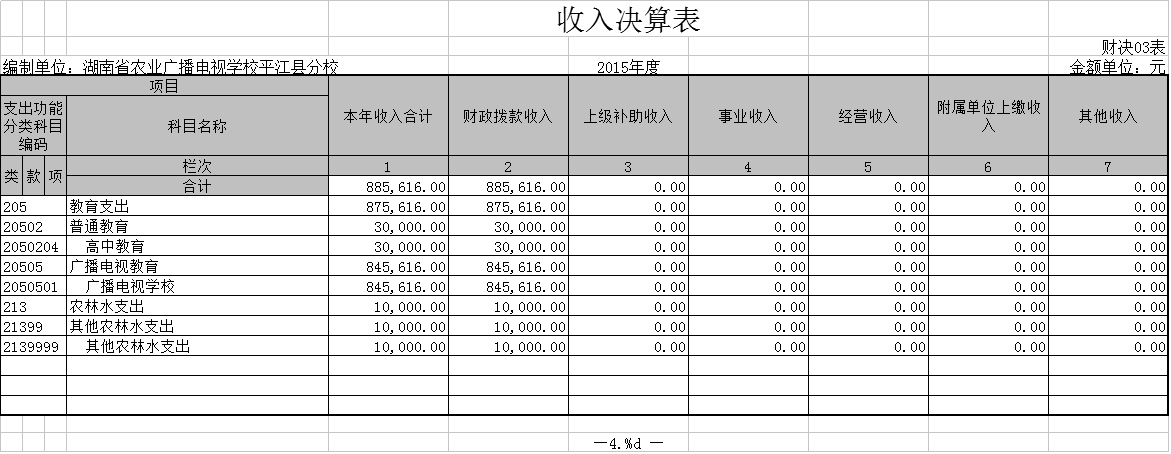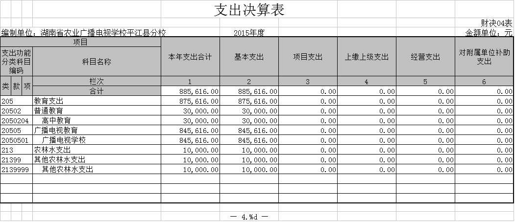 2015年学校财务工作注重学习和提升财务服务能力,积极探索和推进学校财务管理由规范走向科学的整体改革,坚持“服务、效率、和谐、廉洁”的管理理念,紧紧围绕学校2015年事业发展需要,合理安排财力,加强预算管理,理顺业务流程,强化基础工作,努力增收节支,为学校事业发展提供了较好的财力保障。根据财政局2015年财务决算会议精神和要求,编制了湖南省农业广播电视学校平江县分校2015年财务决算报表,呈请审核。现将报表中有关情况分析报告如下: