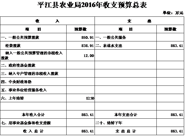 预算总收入863.41元,其中:经费拨款838.91元,纳入公共预算管理的非税收入拨款12万元,上年结转12.5万元。