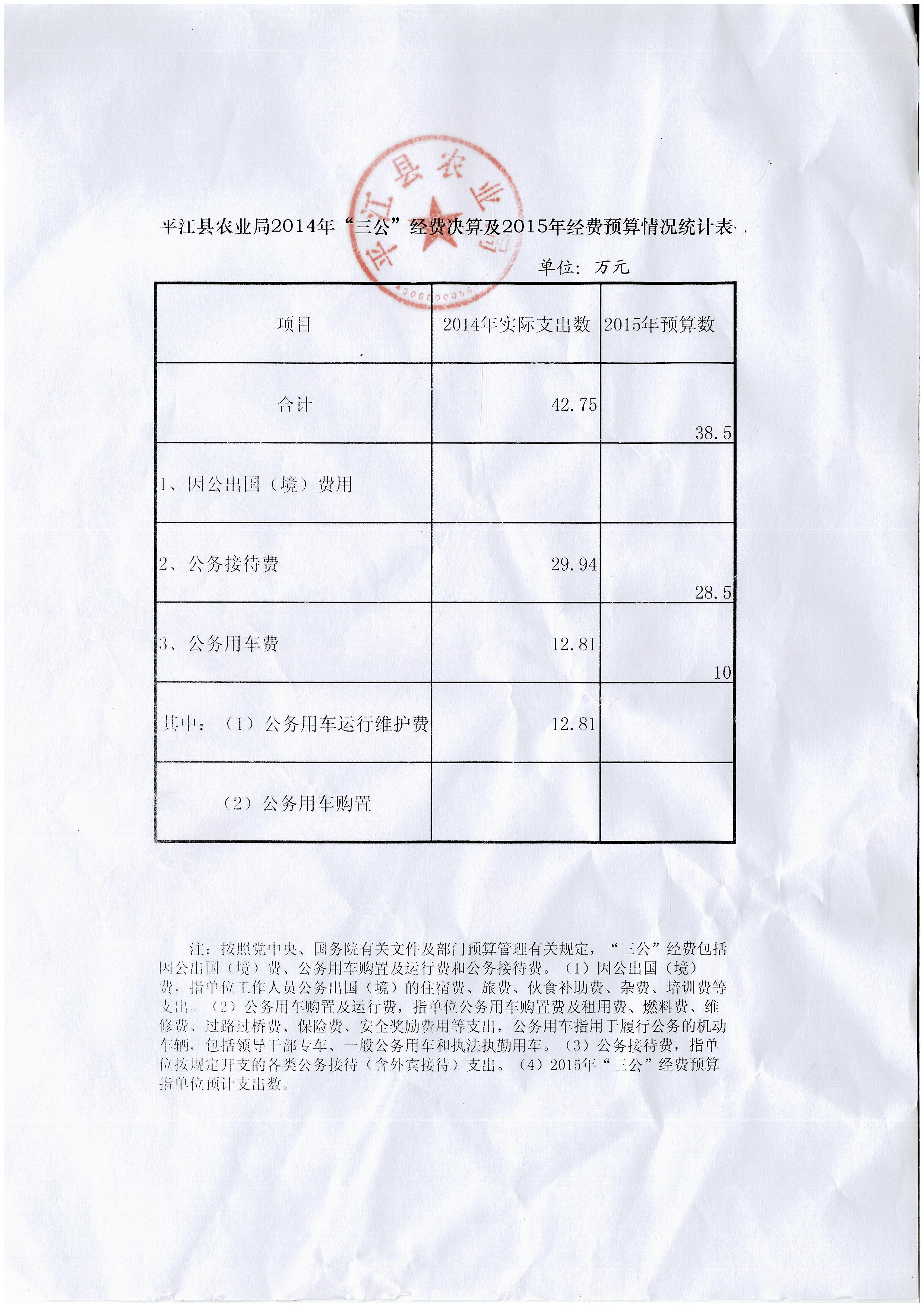 平江县农业局2014年“三公”经费决算及2015年经费预算公开