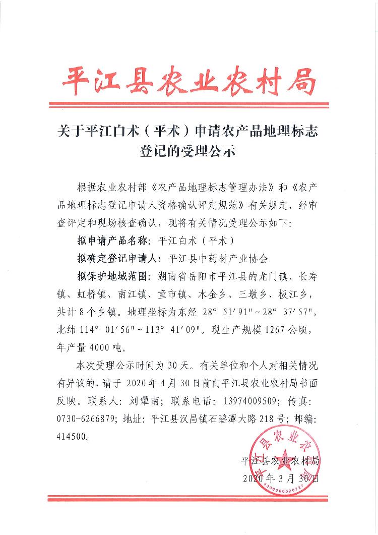 关于平江白术(平术)申请农产品地理标志登记的受理公示