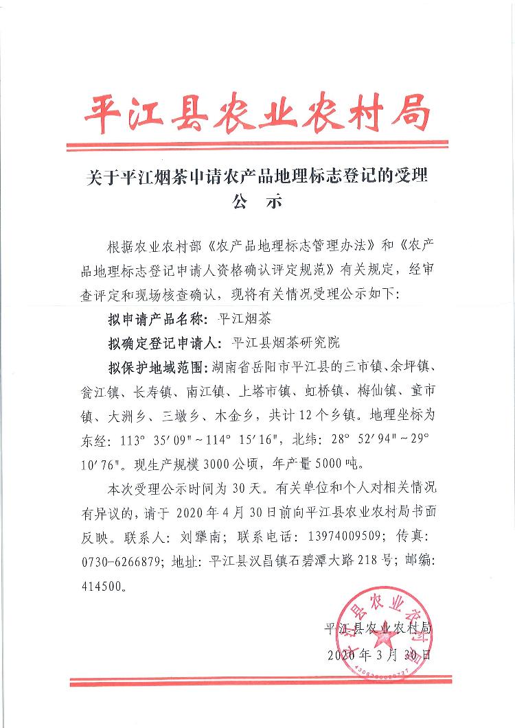 关于平江烟茶申请农产品地理标志登记的受理公示