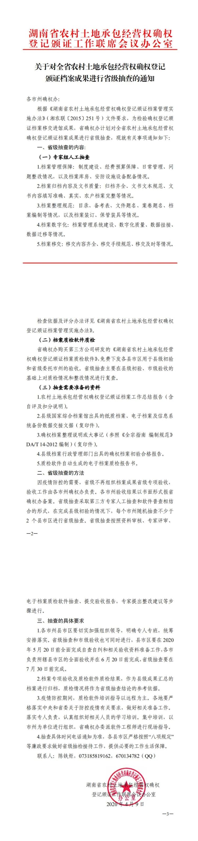 关于对全省农村土地承包经营权确权登记颁证档案成果进行省级抽查的通知