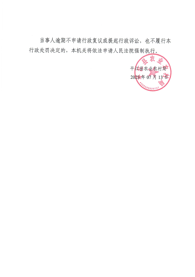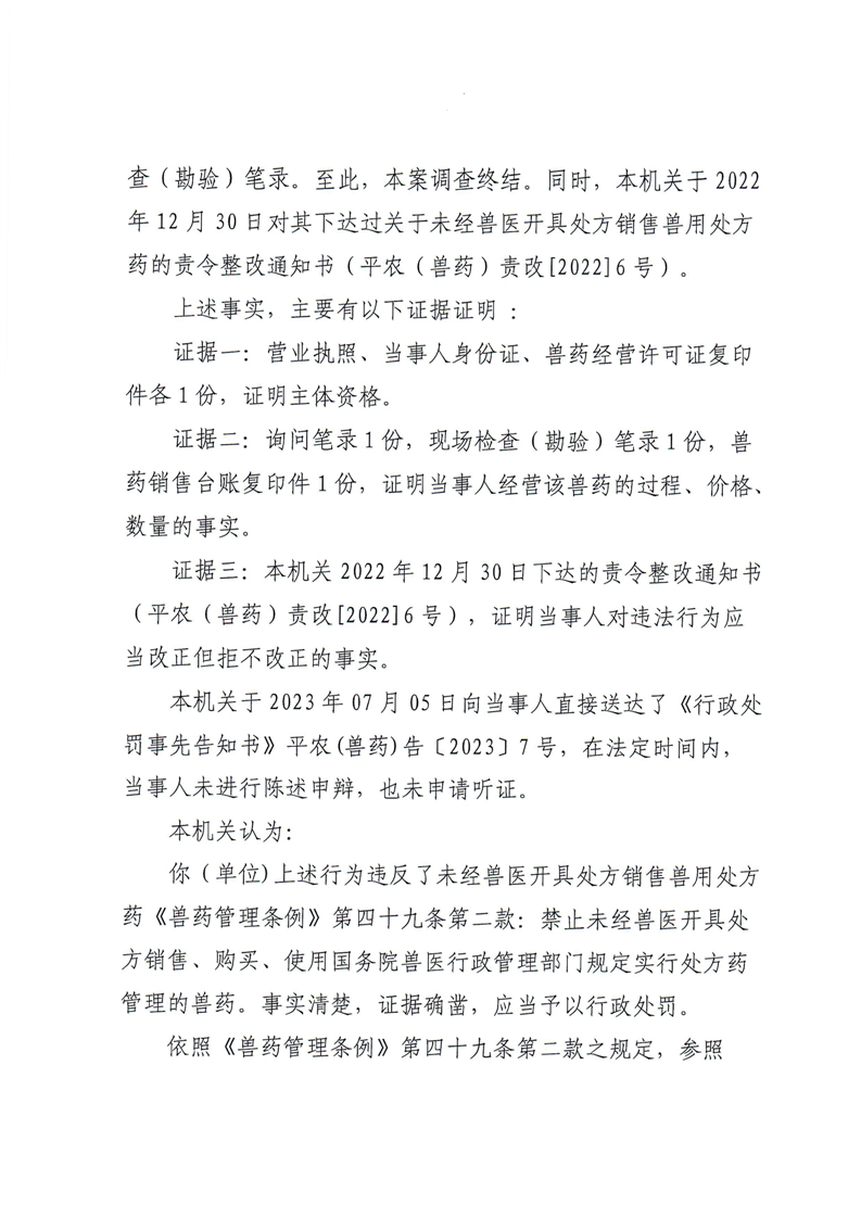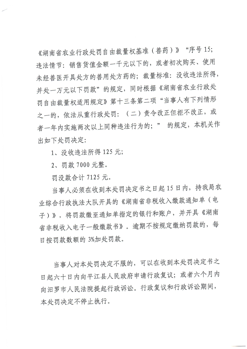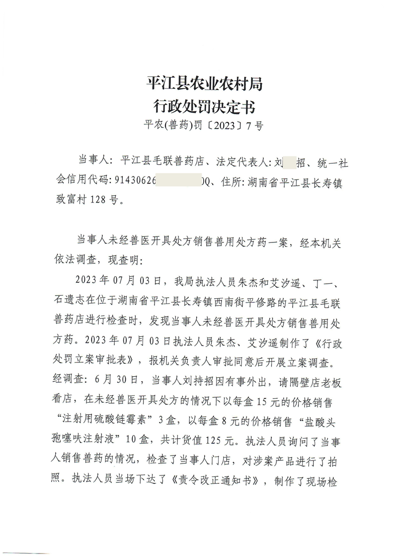 平江县农业农村局行政处罚决定书 平农(兽药)罚〔2023〕7号