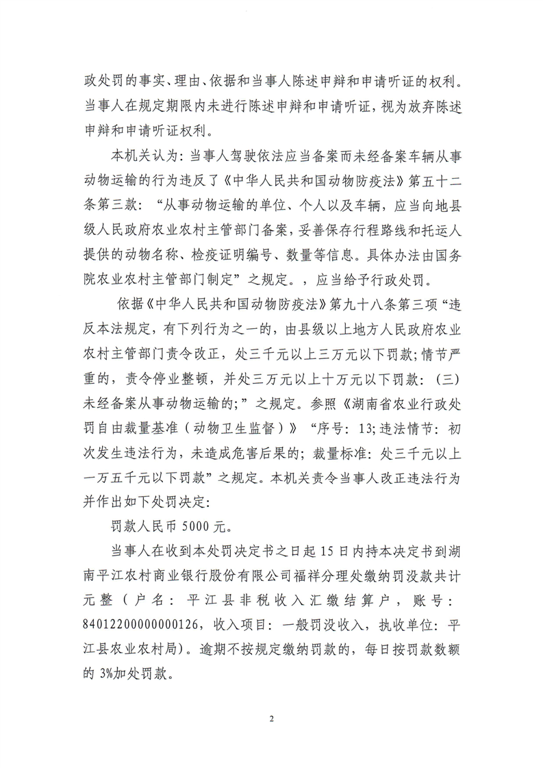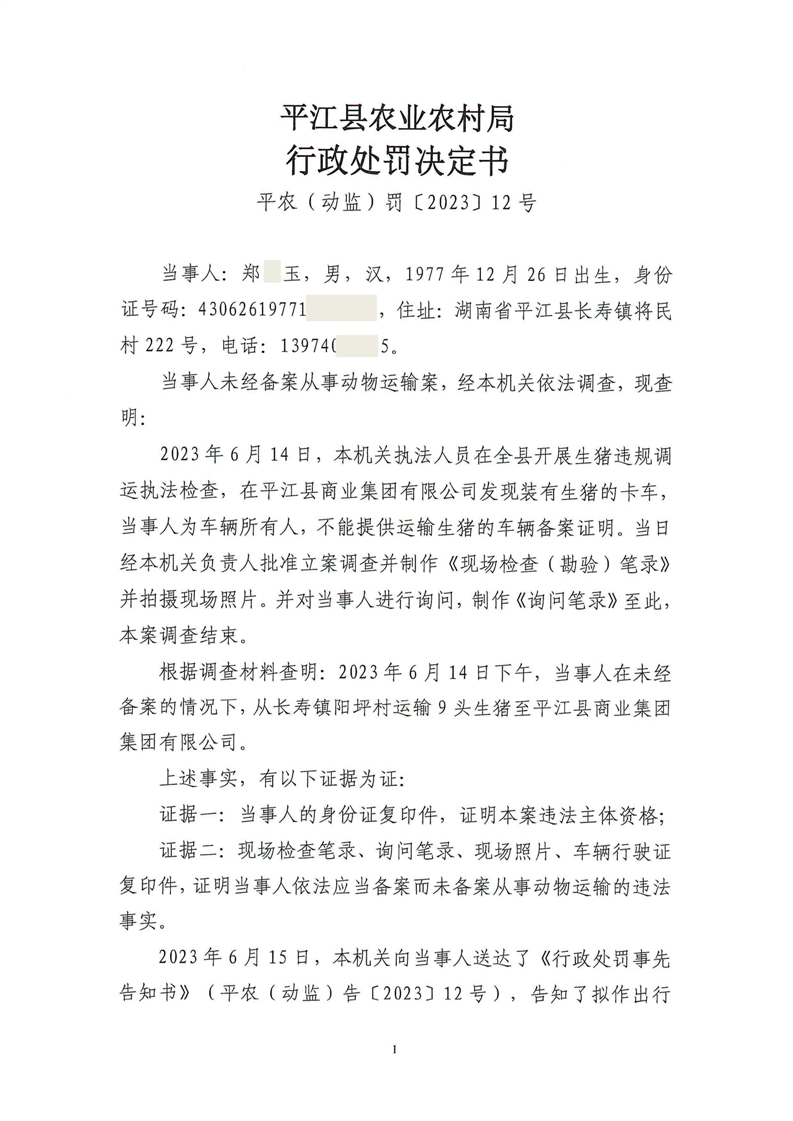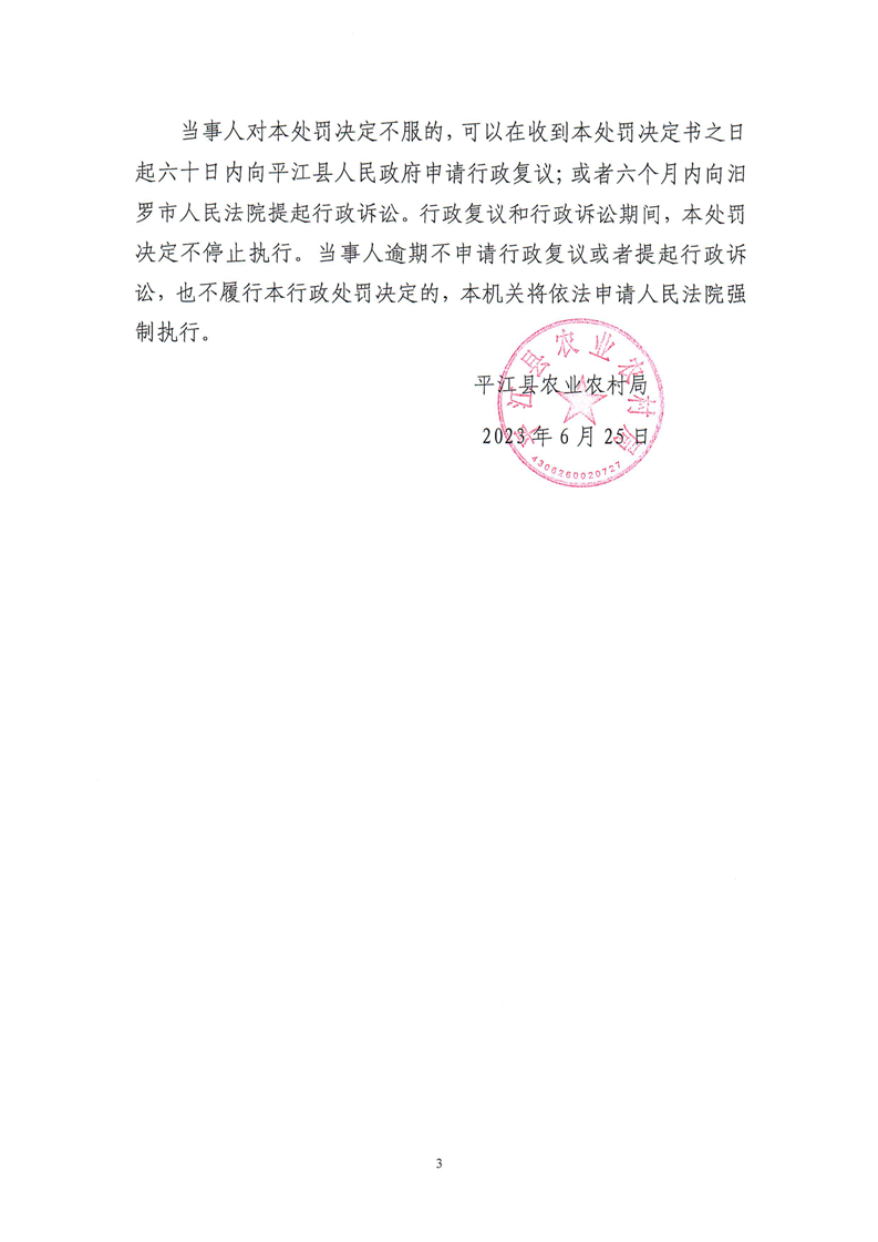 平江县农业农村局行政处罚决定书 平农(动监)罚〔2023〕12号