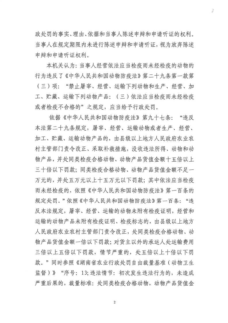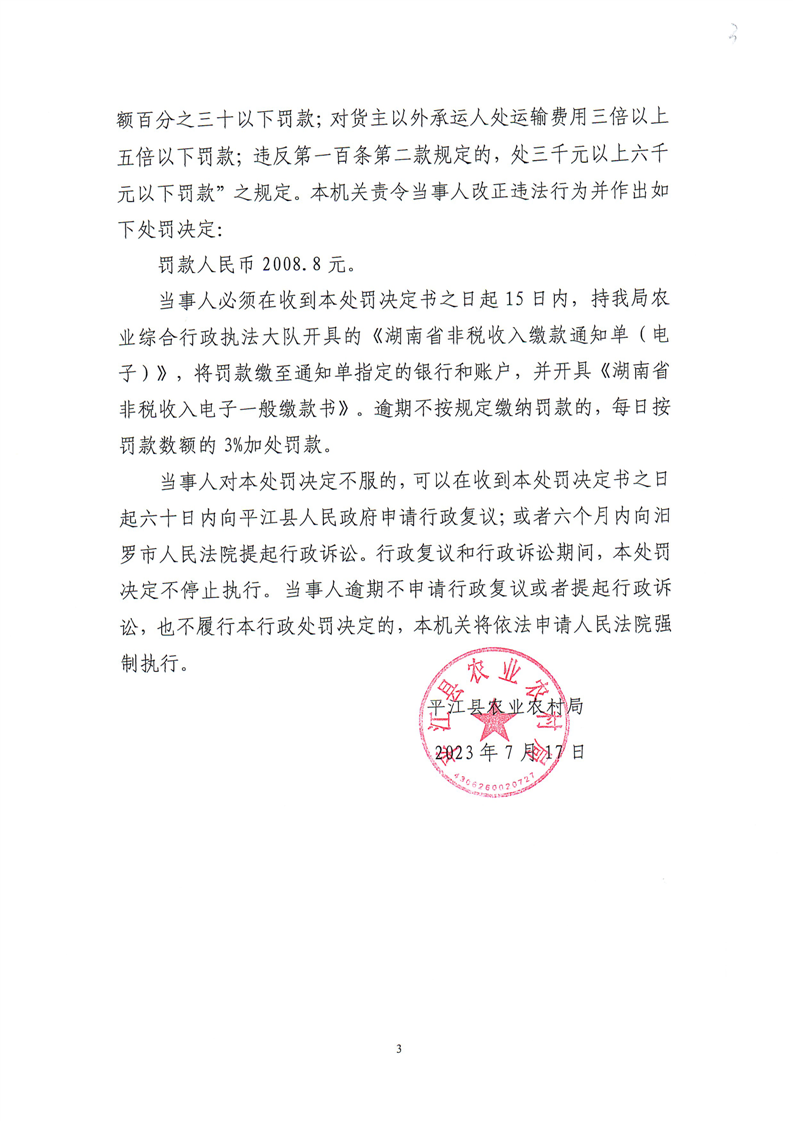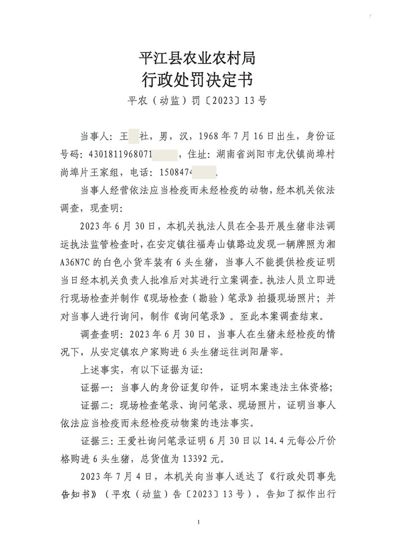 平江县农业农村局行政处罚决定书 平农(动监)罚〔2023〕13号