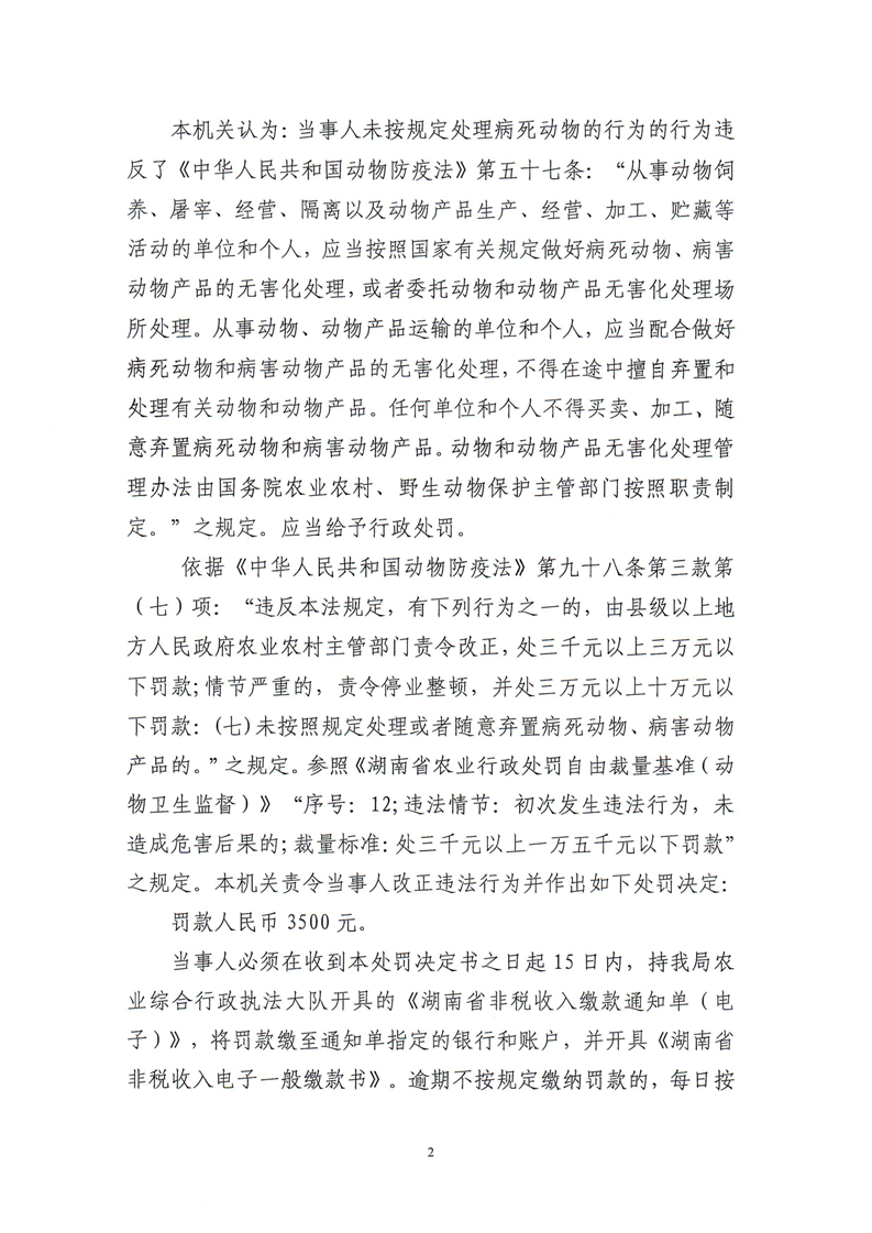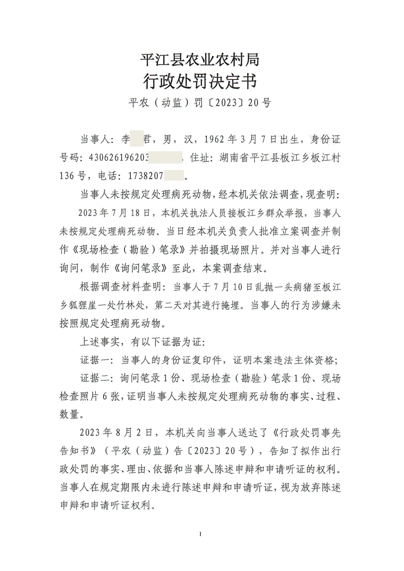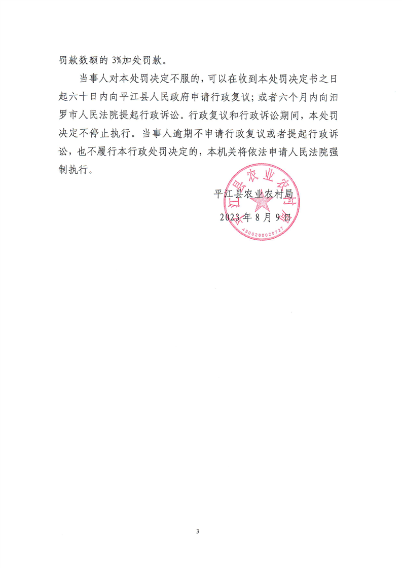 平江县农业农村局行政处罚决定书 平农(动监)罚〔2023〕20号