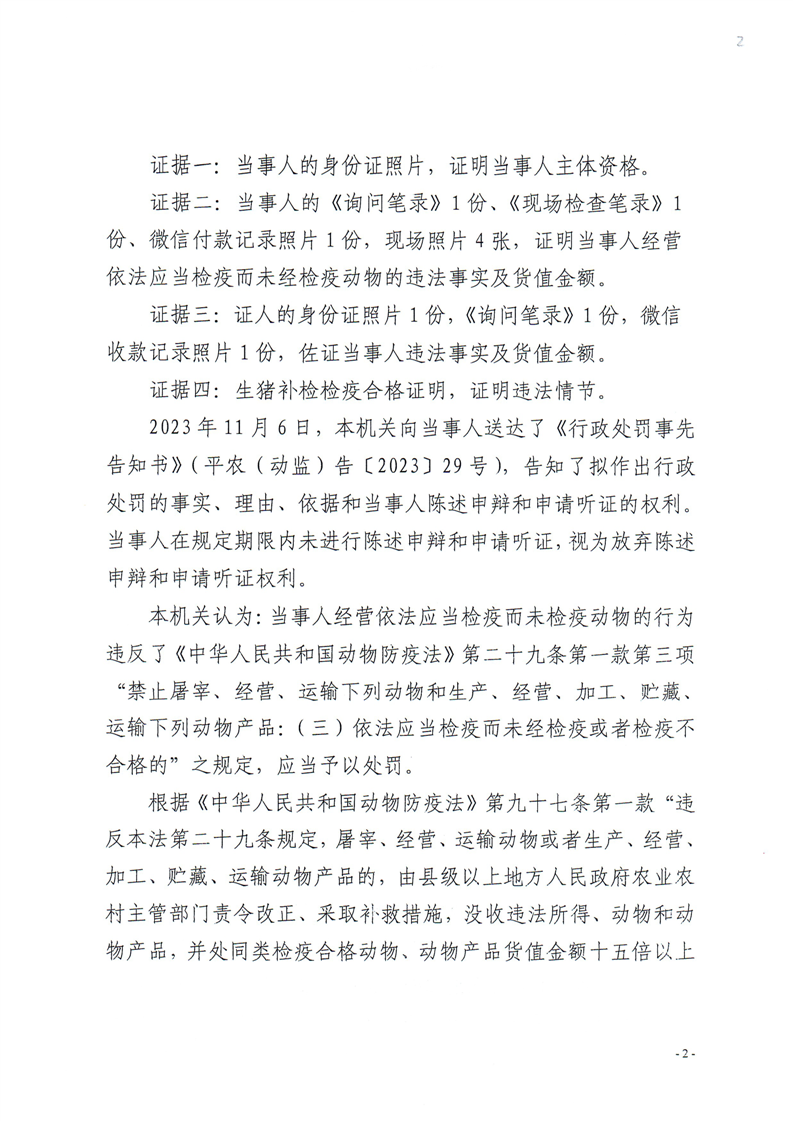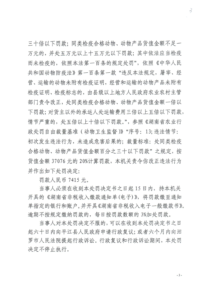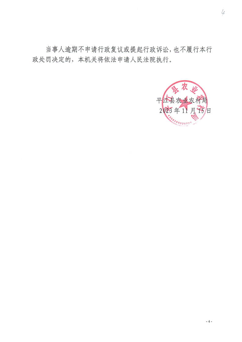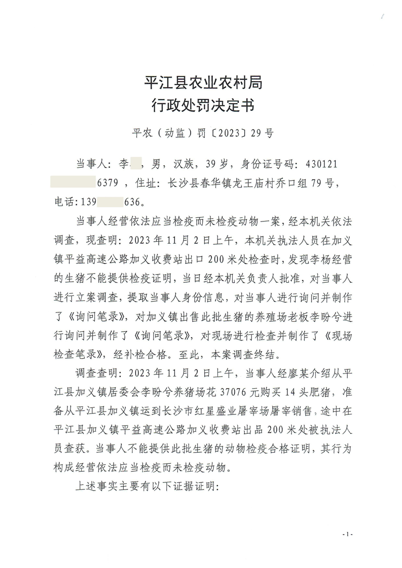 平江县农业农村局行政处罚决定书 平农(动监)罚〔2023〕29号