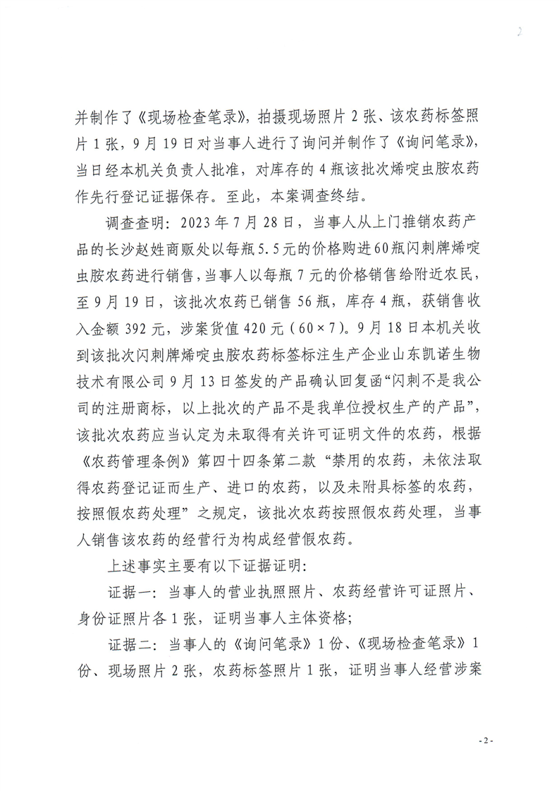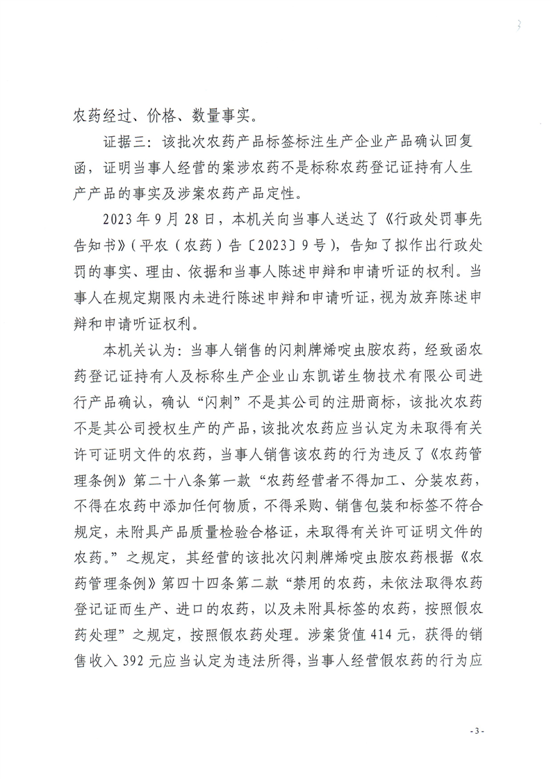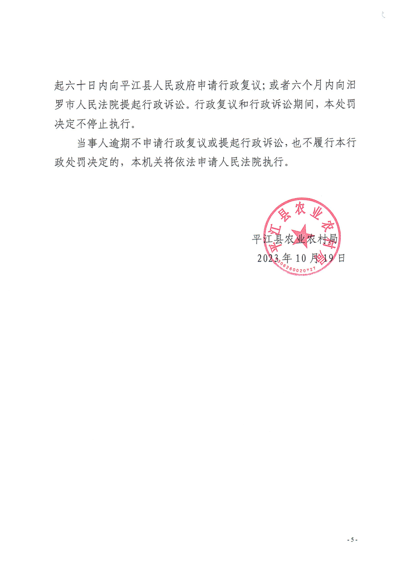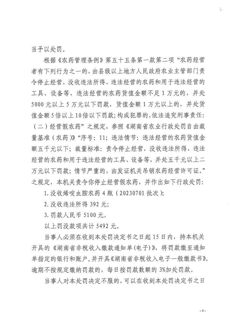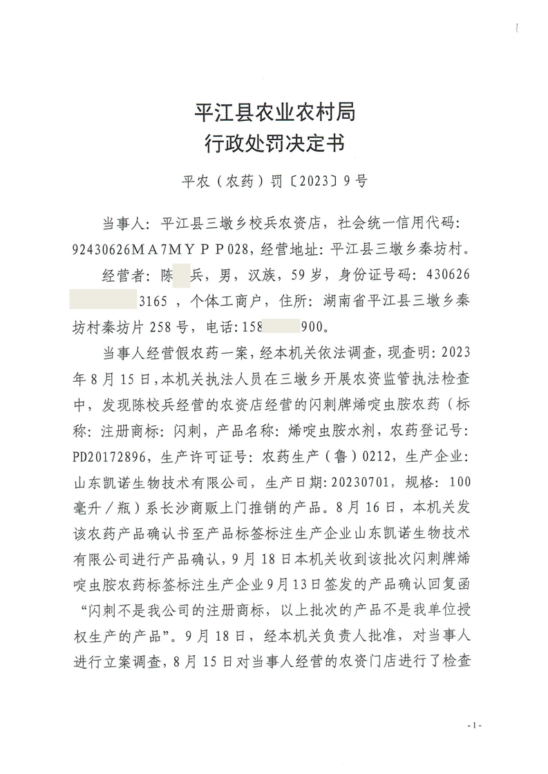 平江县农业农村局行政处罚决定书 平农(农药)罚〔2023〕9号