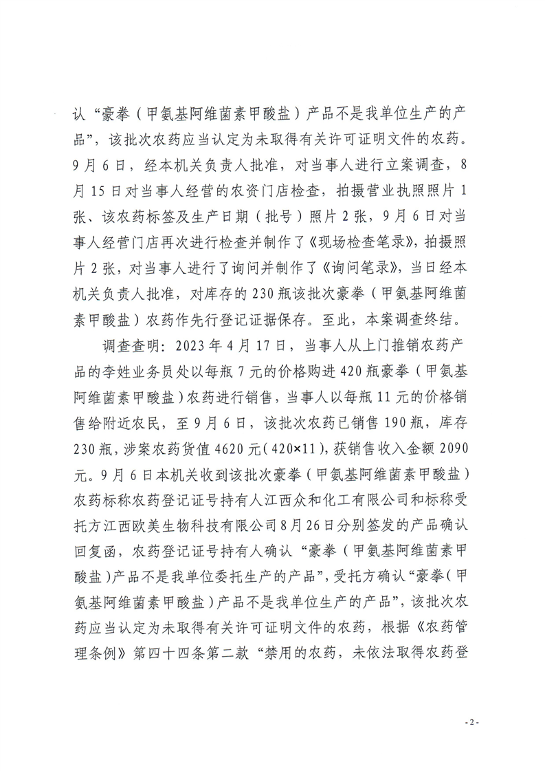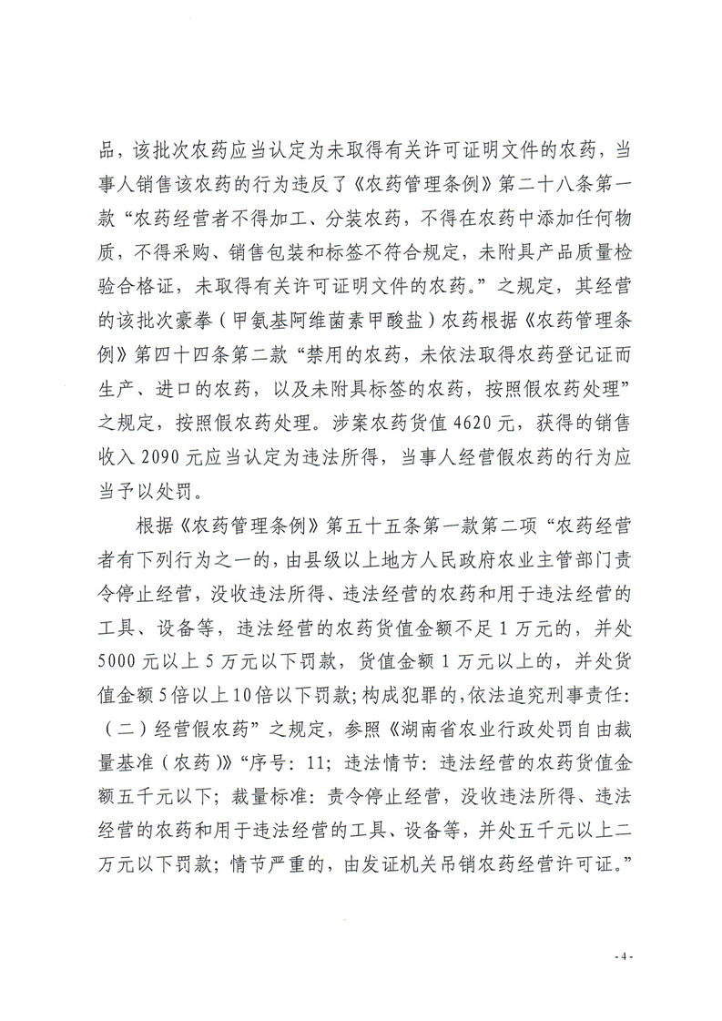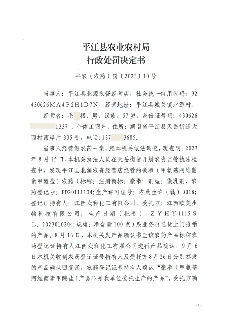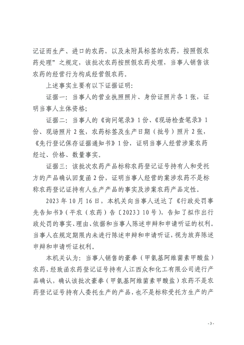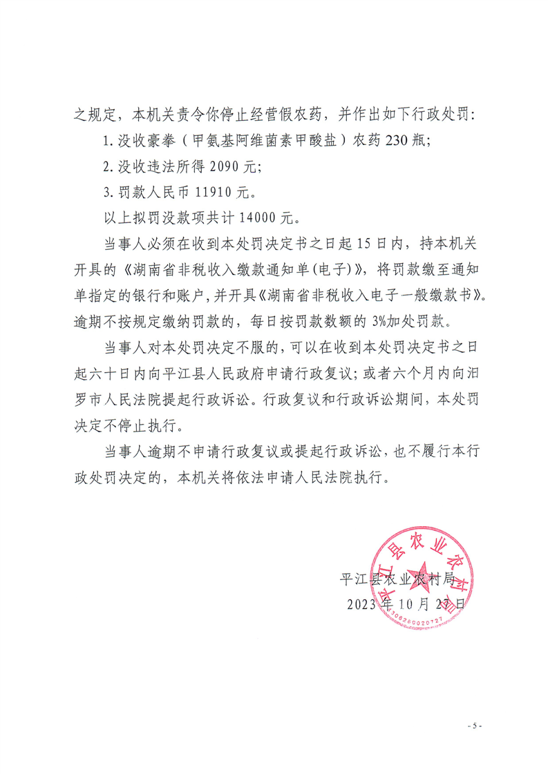 平江县农业农村局行政处罚决定书 平农(农药)罚〔2023〕10号