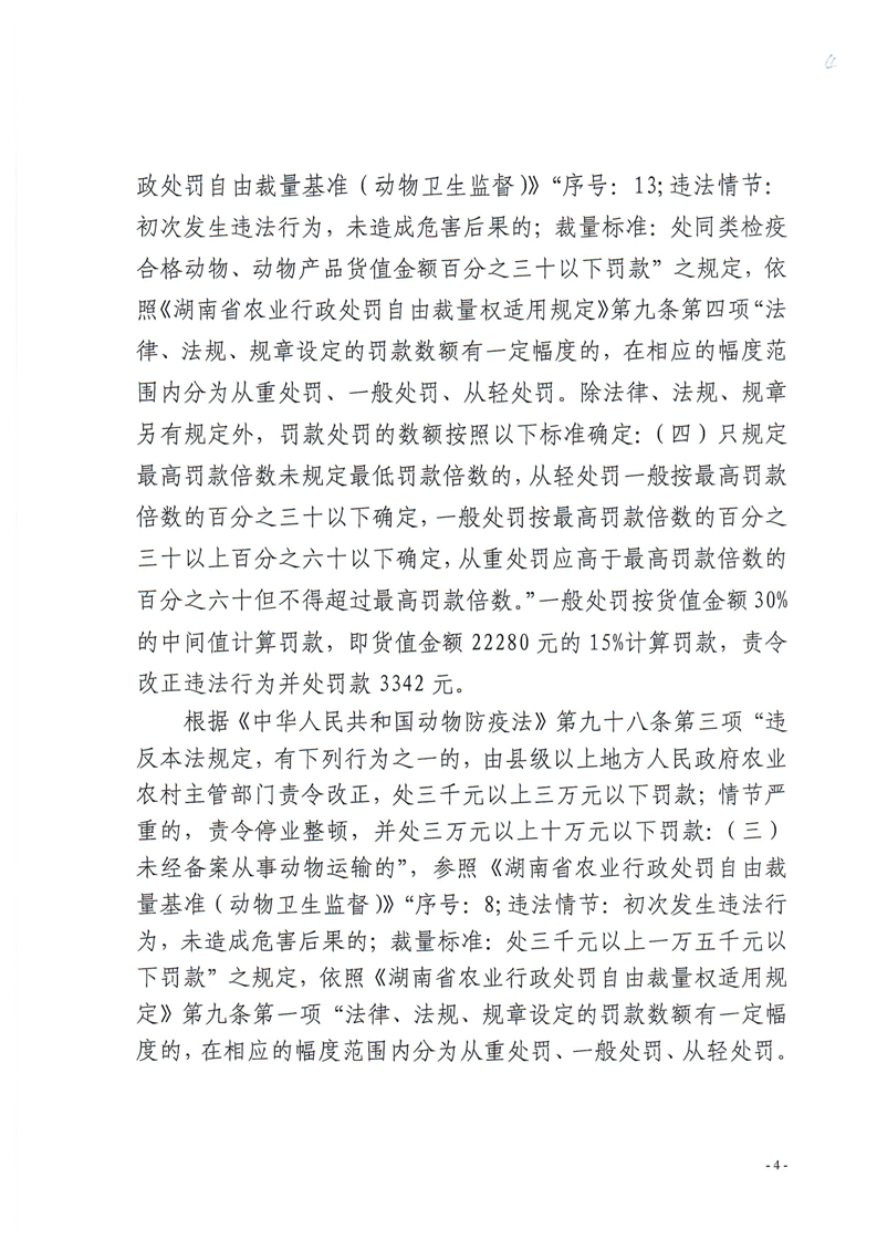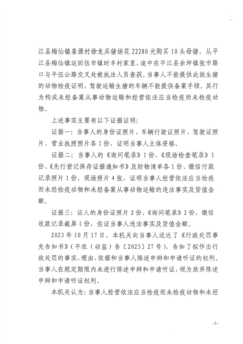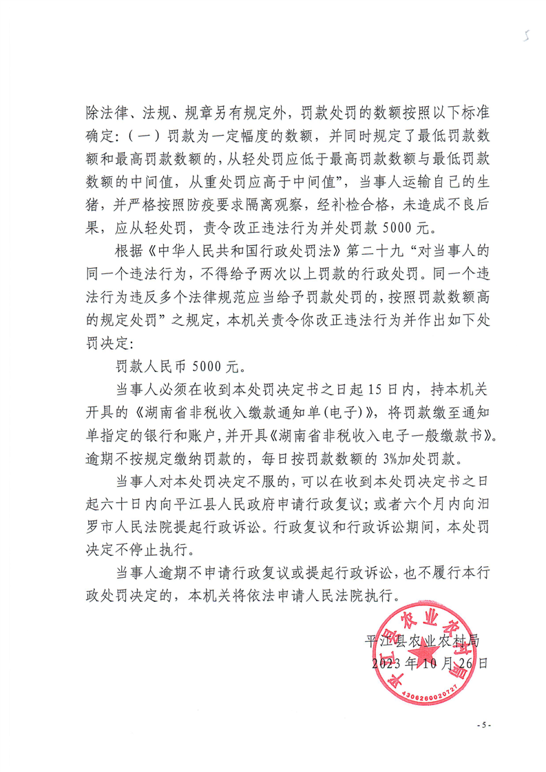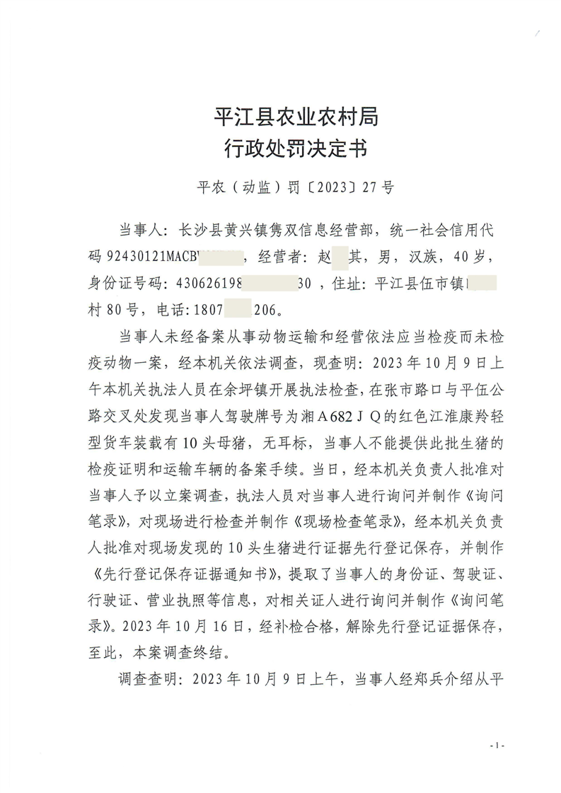 平江县农业农村局行政处罚决定书 平农(动监)罚〔2023〕27号