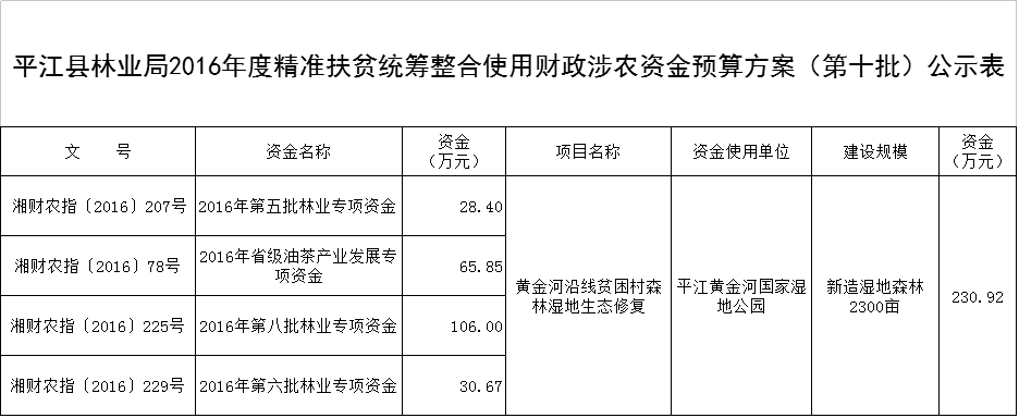 平江县林业局2016年度精准扶贫统筹整合使用财政涉农资金预算方案(第十批)公示表