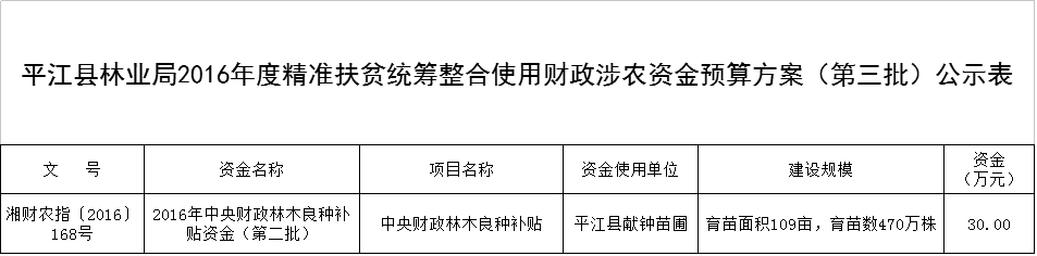 平江县林业局2016年度精准扶贫统筹整合使用财政涉农资金预算方案(第三批)公示表